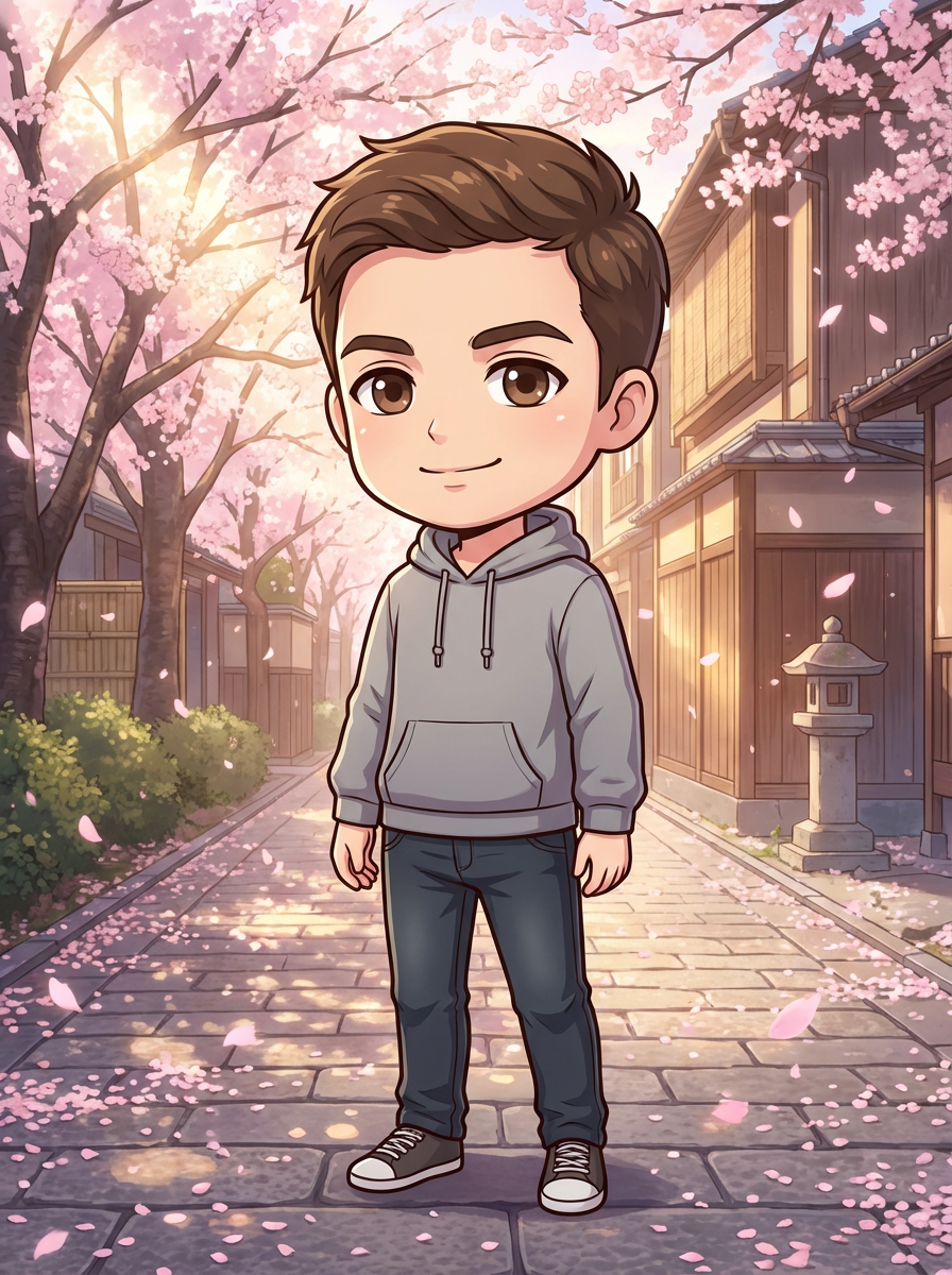 The model as a chibi character standing on a peaceful Japanese street during cherry blossom season, wearing a casual streetwear outfit with a hoodie and sneakers. The background is filled with pink petals and soft sunlight. Highly detailed chibi-style rendering with vibrant colors and a magical atmosphere.