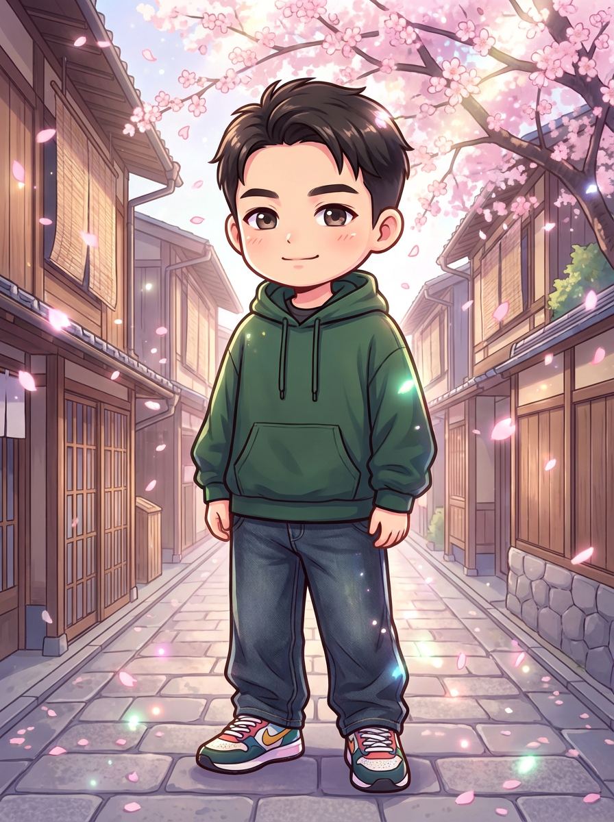 The model as a chibi character standing on a peaceful Japanese street during cherry blossom season, wearing a casual streetwear outfit with a hoodie and sneakers. The background is filled with pink petals and soft sunlight. Highly detailed chibi-style rendering with vibrant colors and a magical atmosphere.
