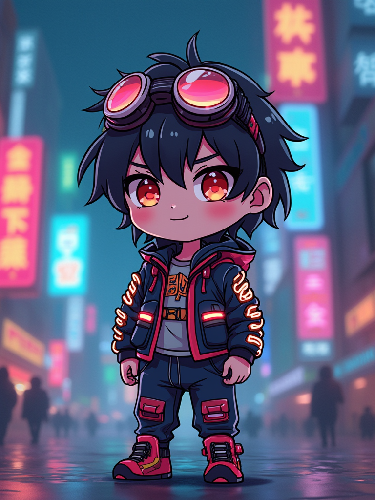 The model as a chibi cyberpunk explorer, with neon highlights and a tiny visor, wearing a tech jacket with neon stripes and goggles. The background is a mini cityscape with glowing signs. The style is in cute chibi anime illustration.