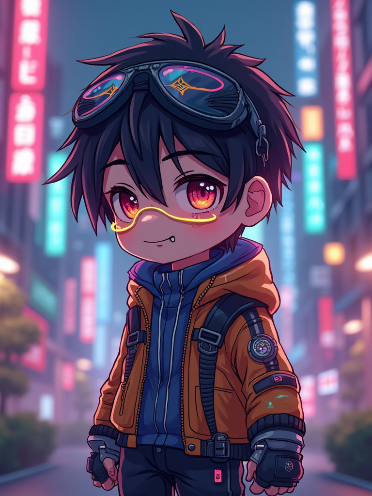 The model as a chibi cyberpunk explorer, with neon highlights and a tiny visor, wearing a tech jacket with neon stripes and goggles. The background is a mini cityscape with glowing signs. The style is in cute chibi anime illustration.