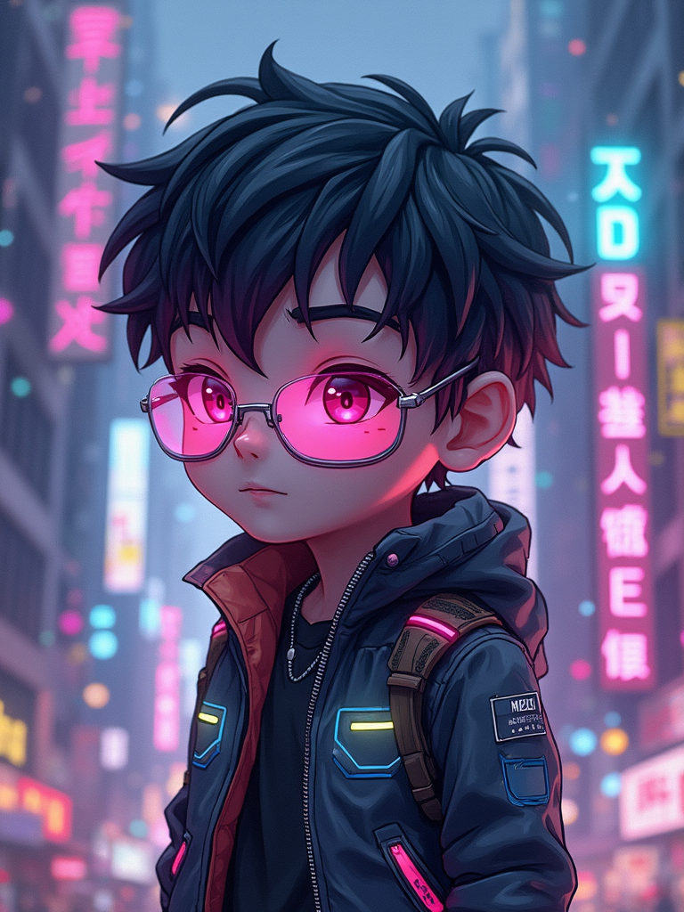 The model as a chibi cyberpunk explorer, with neon highlights and a tiny visor, wearing a tech jacket with neon stripes and goggles. The background is a mini cityscape with glowing signs. The style is in cute chibi anime illustration.