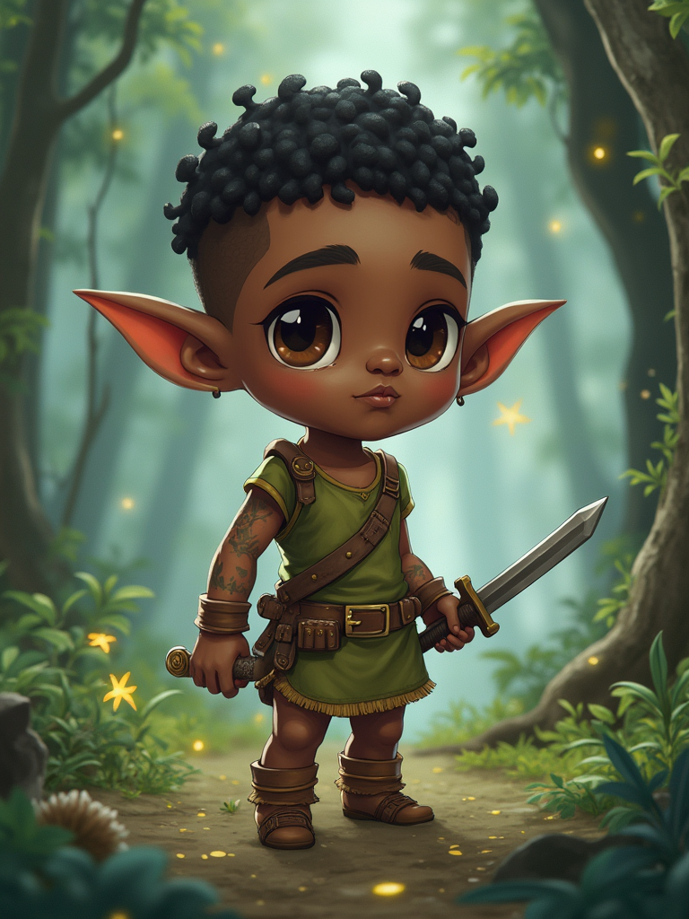 The model as a chibi elf with pointy ears and glowing tattoos, dressed in a tunic with a tiny sword. The setting is a magical forest. The style is in cute chibi anime illustration.