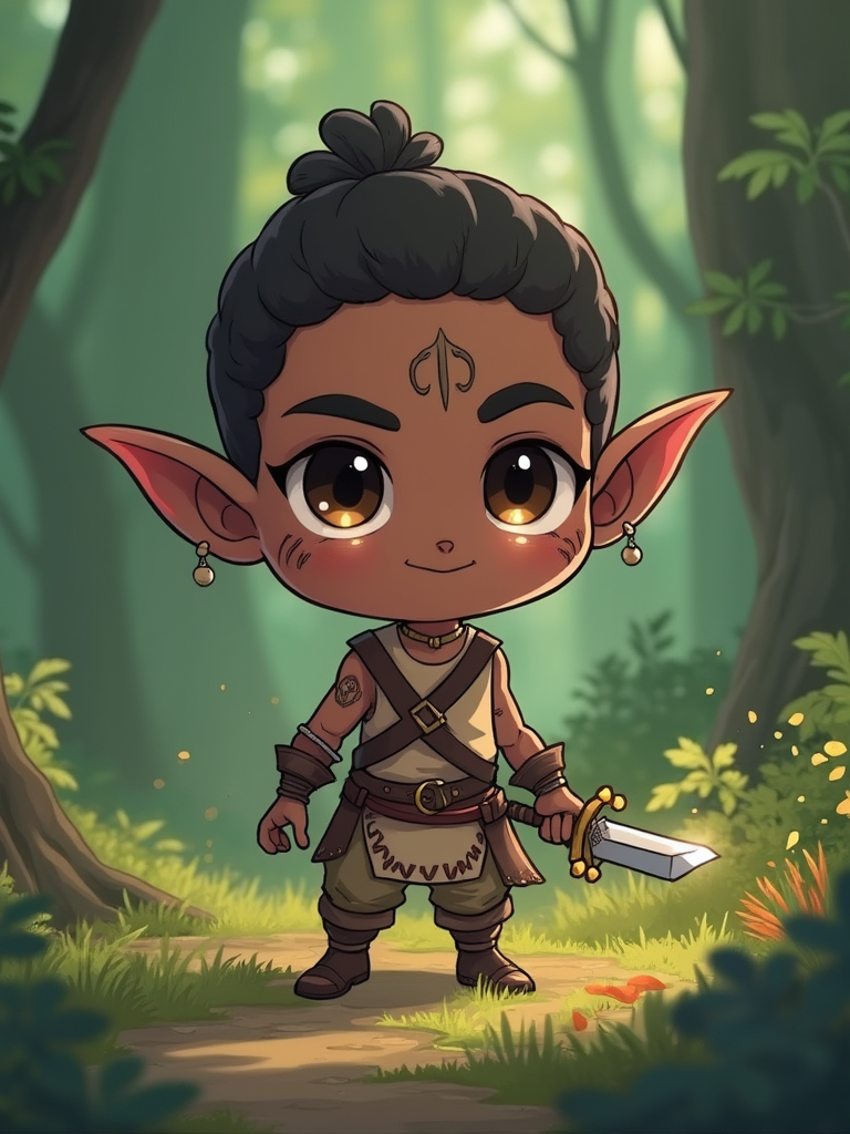 The model as a chibi elf with pointy ears and glowing tattoos, dressed in a tunic with a tiny sword. The setting is a magical forest. The style is in cute chibi anime illustration.