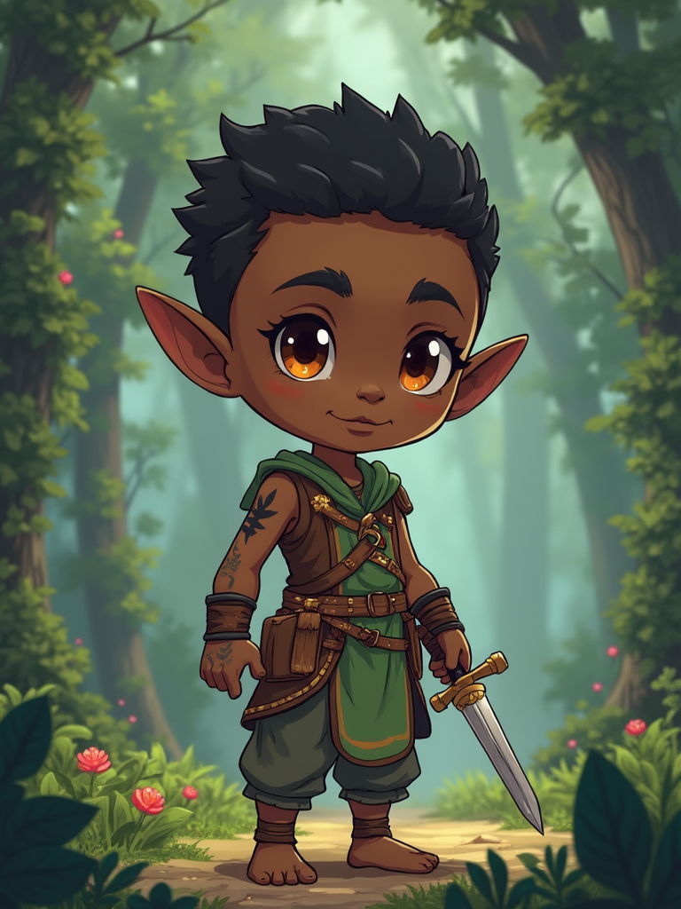 The model as a chibi elf with pointy ears and glowing tattoos, dressed in a tunic with a tiny sword. The setting is a magical forest. The style is in cute chibi anime illustration.