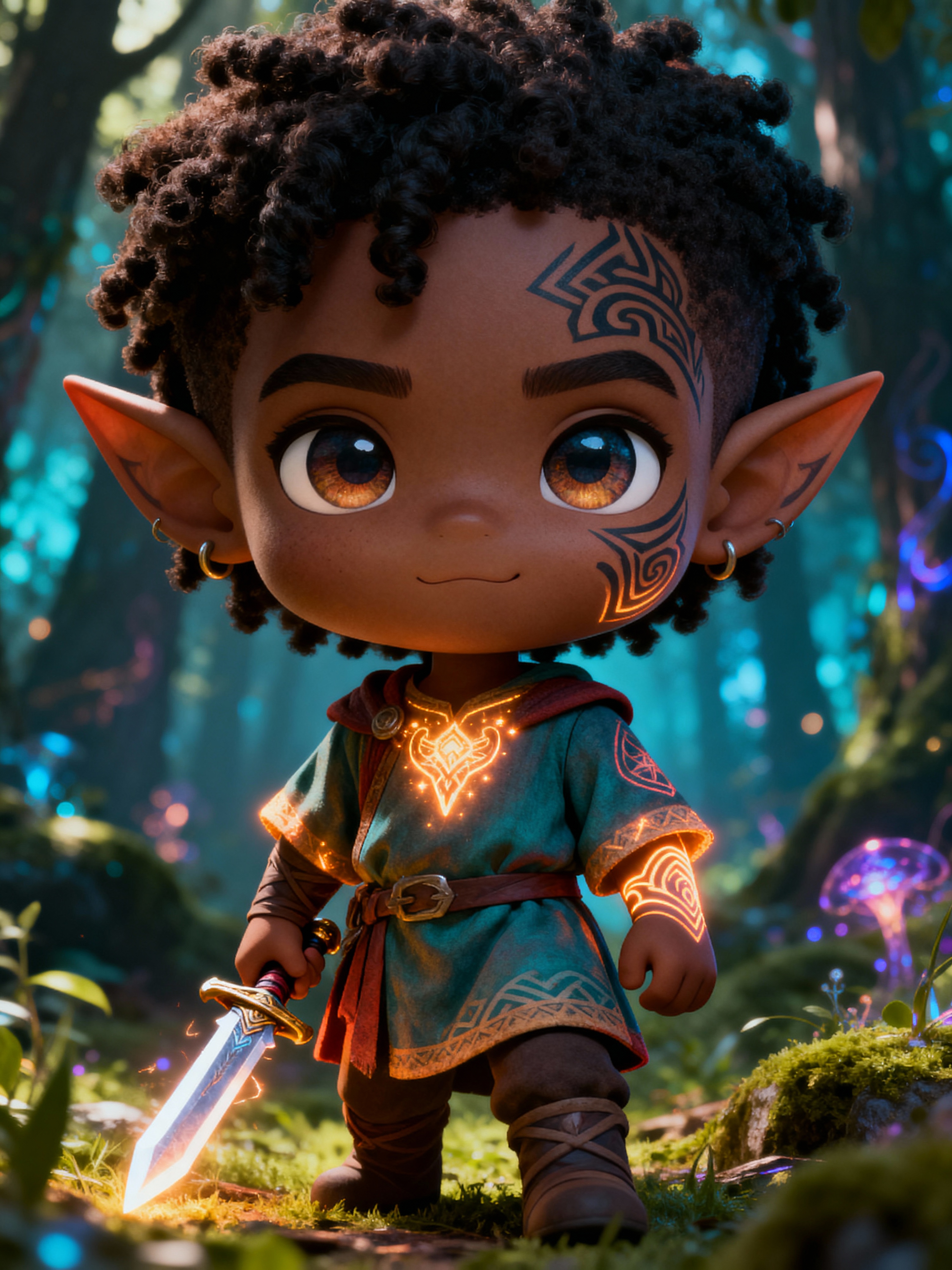 The model as a chibi elf with pointy ears and glowing tattoos, dressed in a tunic with a tiny sword. The setting is a magical forest. The style is in cute chibi anime illustration.