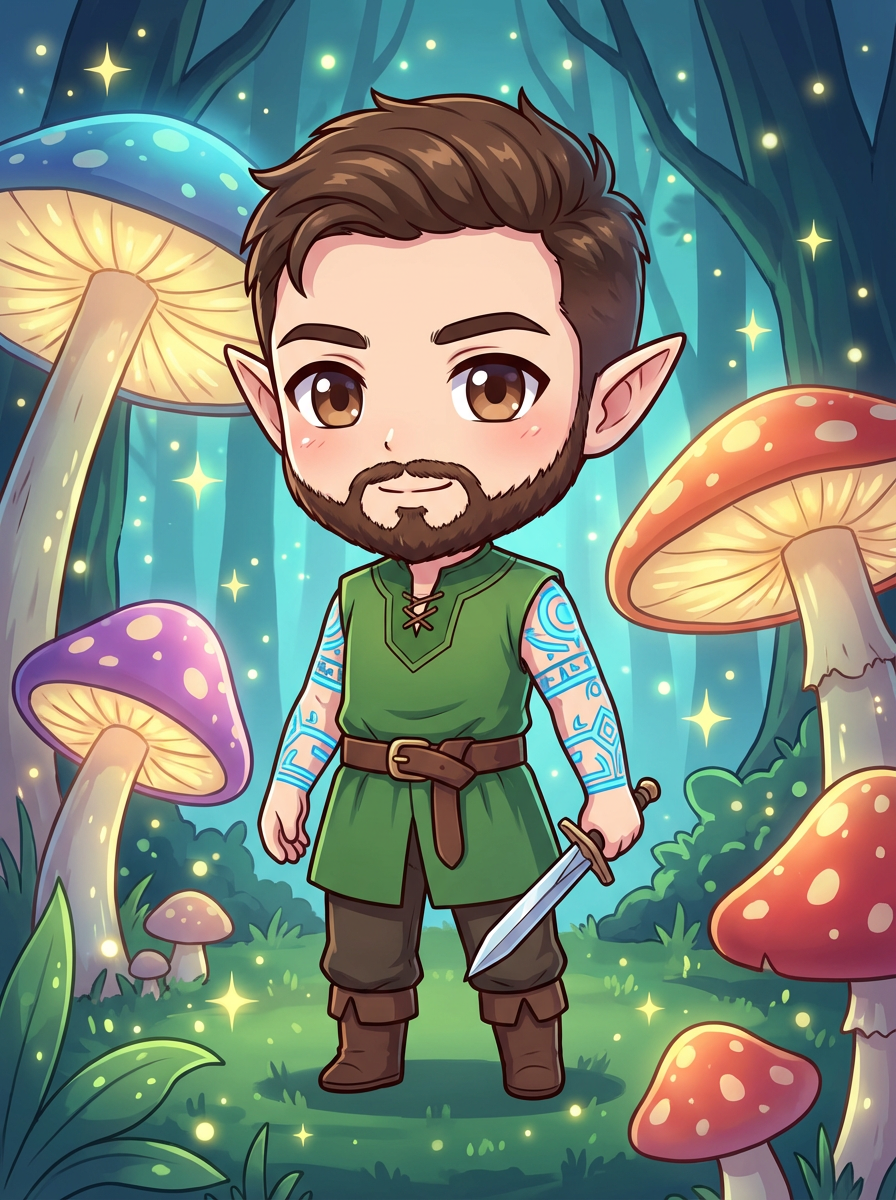 The model as a chibi elf with pointy ears and glowing tattoos, dressed in a tunic with a tiny sword. The setting is a magical forest. The style is in cute chibi anime illustration.