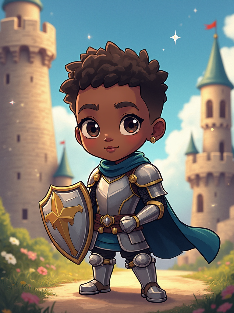The model as a chibi fantasy warrior, dressed in a knight's armor with a tiny shield. The setting is a magical castle with sparkles. The style is in cute chibi anime illustration.