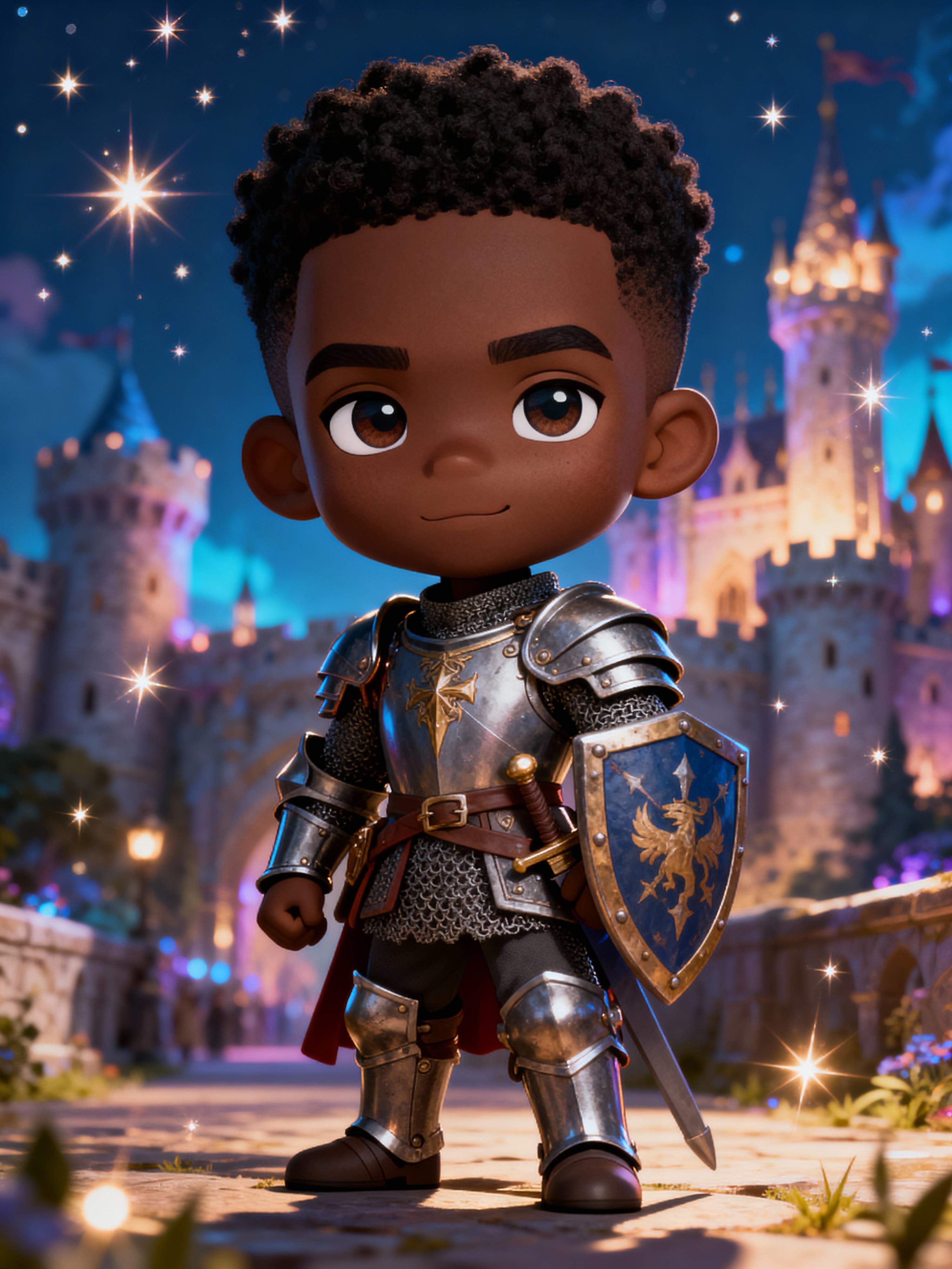 The model as a chibi fantasy warrior, dressed in a knight's armor with a tiny shield. The setting is a magical castle with sparkles. The style is in cute chibi anime illustration.