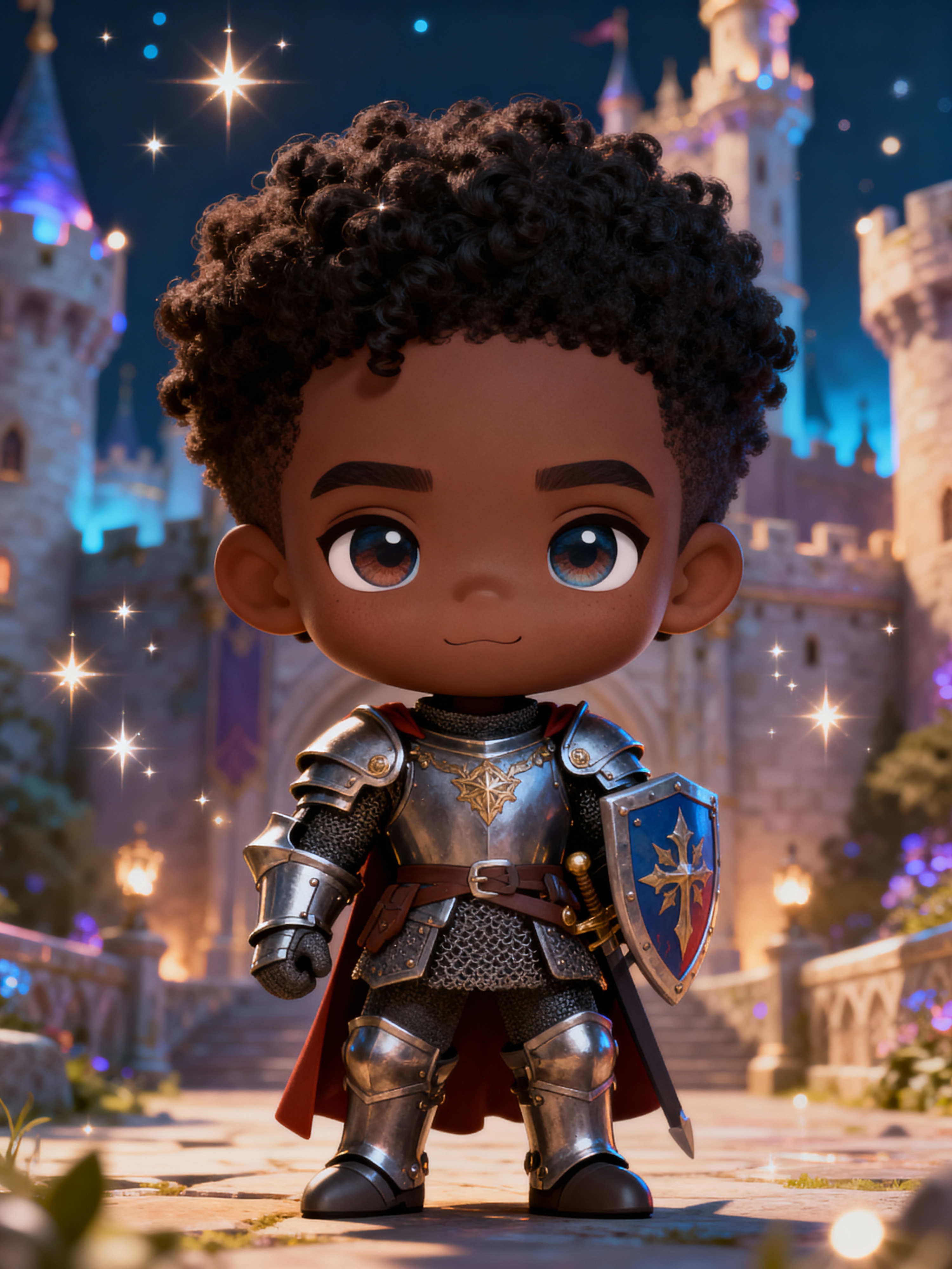 The model as a chibi fantasy warrior, dressed in a knight's armor with a tiny shield. The setting is a magical castle with sparkles. The style is in cute chibi anime illustration.
