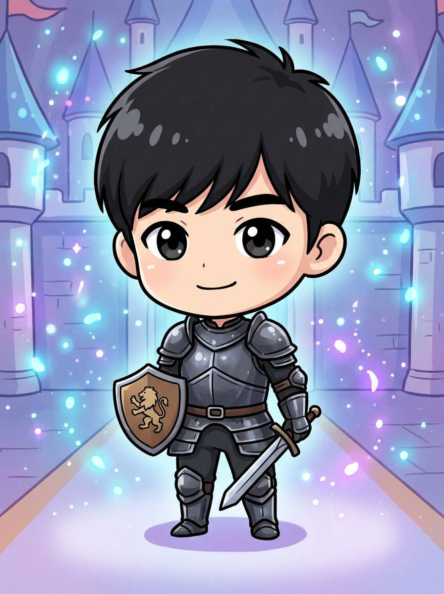 The model as a chibi fantasy warrior, dressed in a knight's armor with a tiny shield. The setting is a magical castle with sparkles. The style is in cute chibi anime illustration.