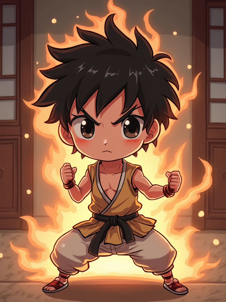 The model as a chibi martial artist, striking a pose with a glowing aura, wearing a sleeveless outfit with a determined face. The background is a classic anime dojo. The style is in cute chibi anime illustration.
