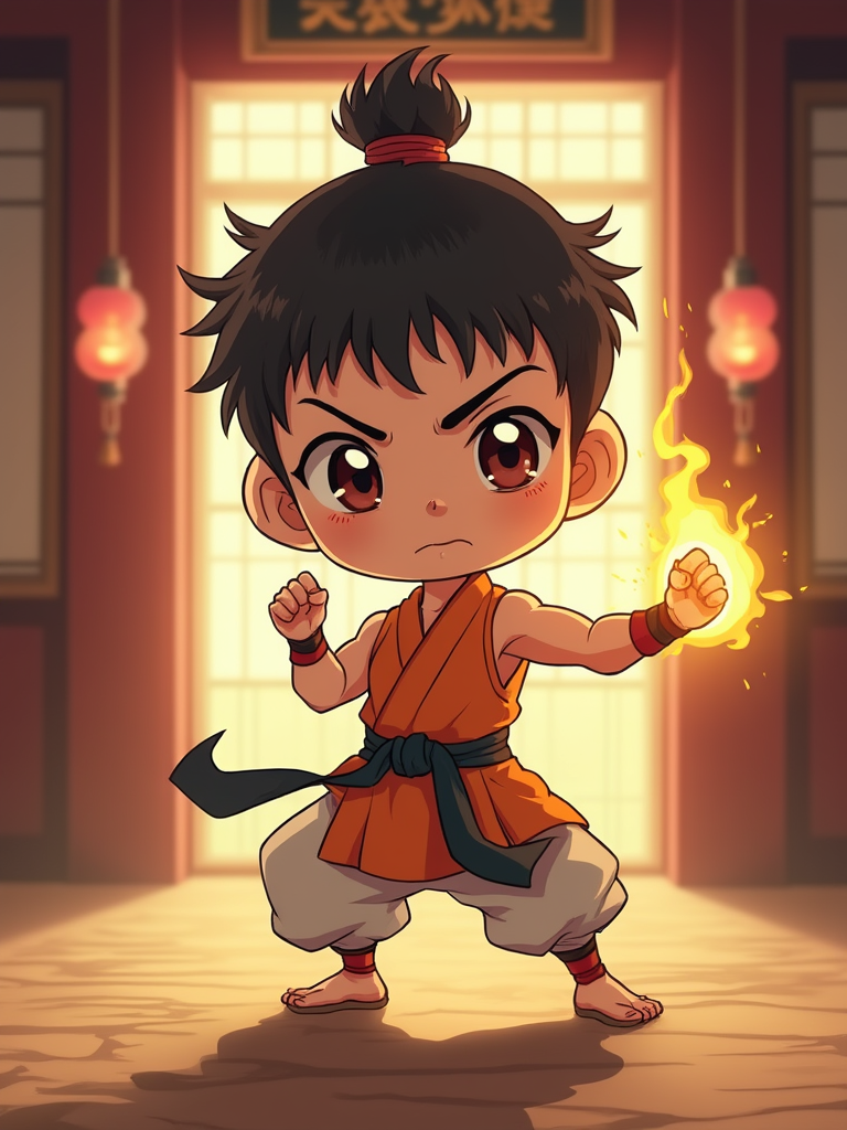 The model as a chibi martial artist, striking a pose with a glowing aura, wearing a sleeveless outfit with a determined face. The background is a classic anime dojo. The style is in cute chibi anime illustration.