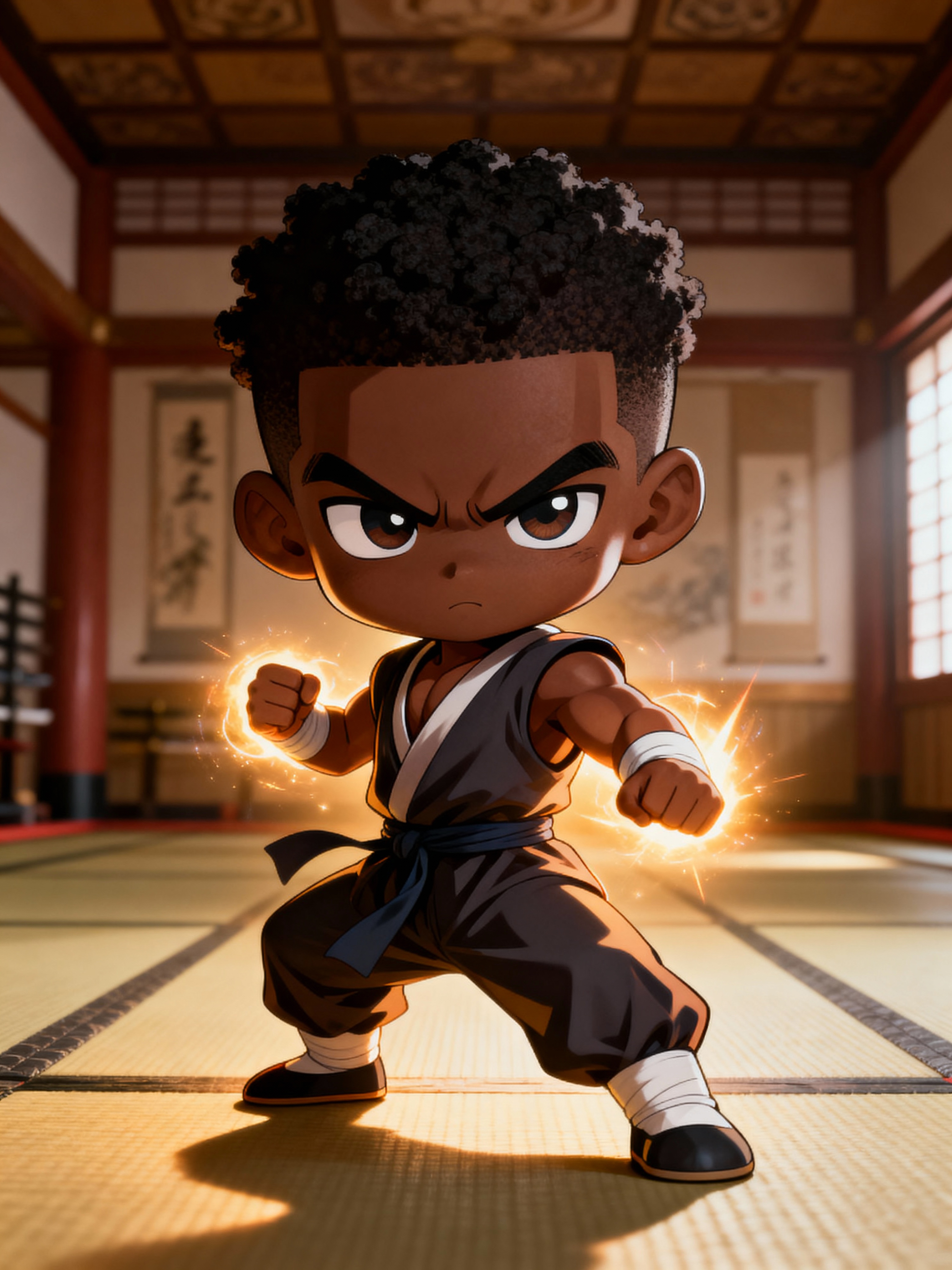 The model as a chibi martial artist, striking a pose with a glowing aura, wearing a sleeveless outfit with a determined face. The background is a classic anime dojo. The style is in cute chibi anime illustration.