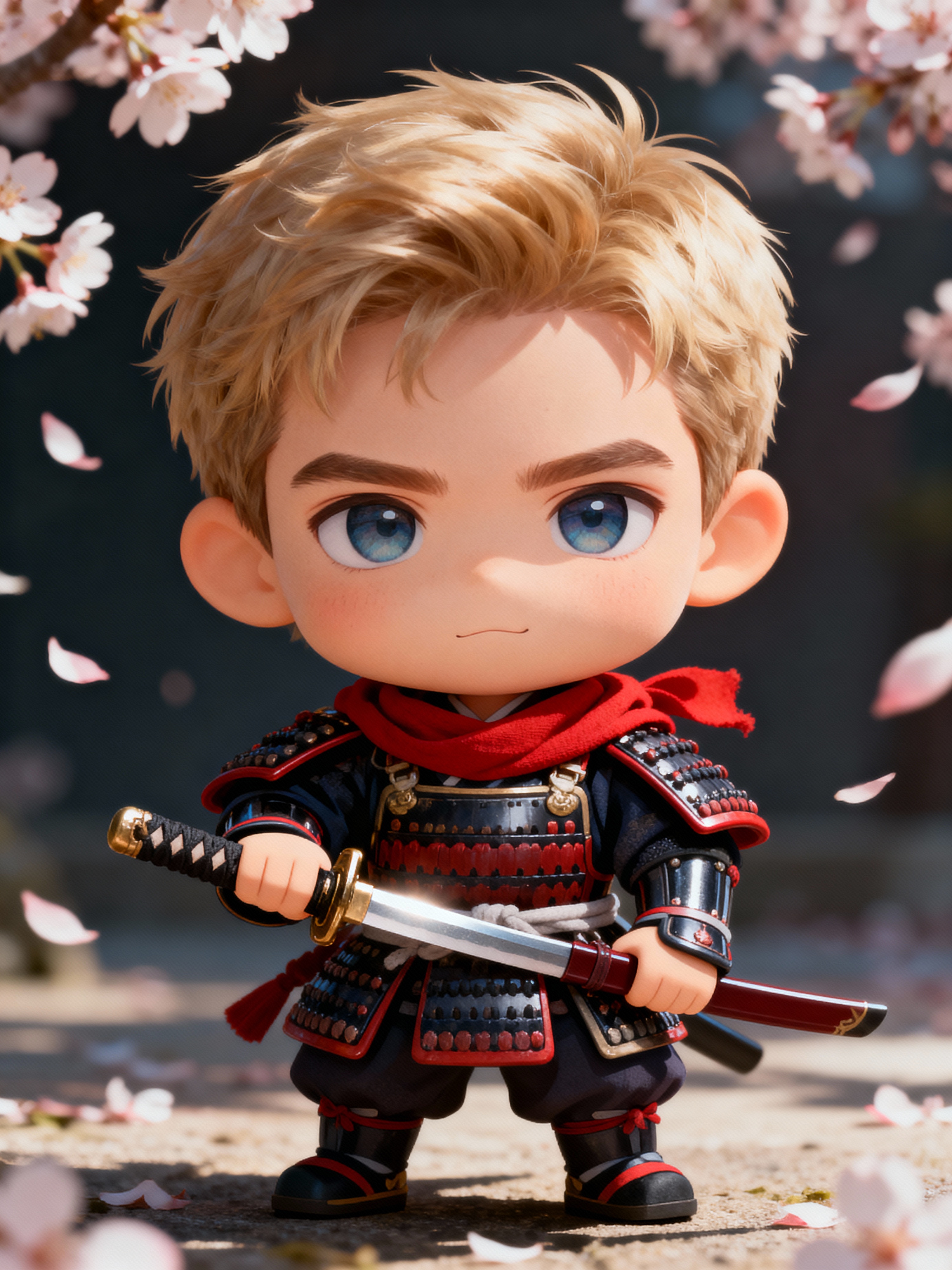 The model as a chibi samurai, holding a tiny katana, wearing a small samurai armor with a red scarf. The background features falling cherry blossoms. The style is in cute chibi anime illustration.