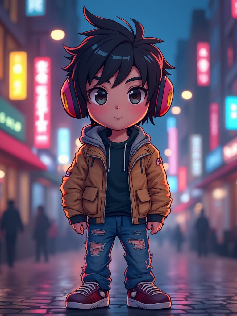 The model as a chibi streetwear character, wearing a trendy jacket, ripped jeans, and headphones. The background is a neon-lit city at night. The style is in cute chibi anime illustration.