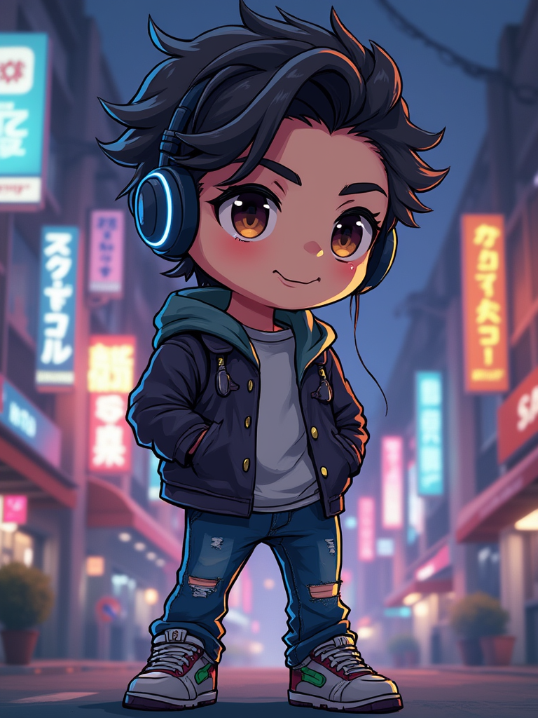 The model as a chibi streetwear character, wearing a trendy jacket, ripped jeans, and headphones. The background is a neon-lit city at night. The style is in cute chibi anime illustration.