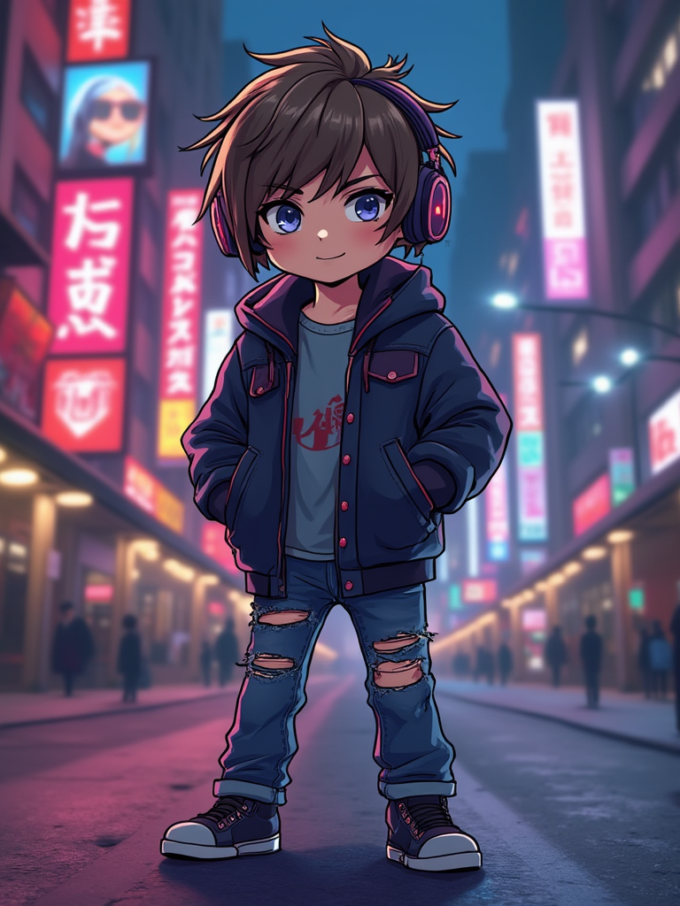 The model as a chibi streetwear character, wearing a trendy jacket, ripped jeans, and headphones. The background is a neon-lit city at night. The style is in cute chibi anime illustration.