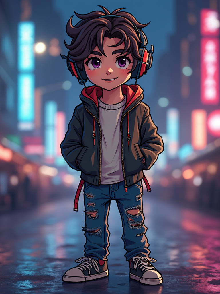 The model as a chibi streetwear character, wearing a trendy jacket, ripped jeans, and headphones. The background is a neon-lit city at night. The style is in cute chibi anime illustration.