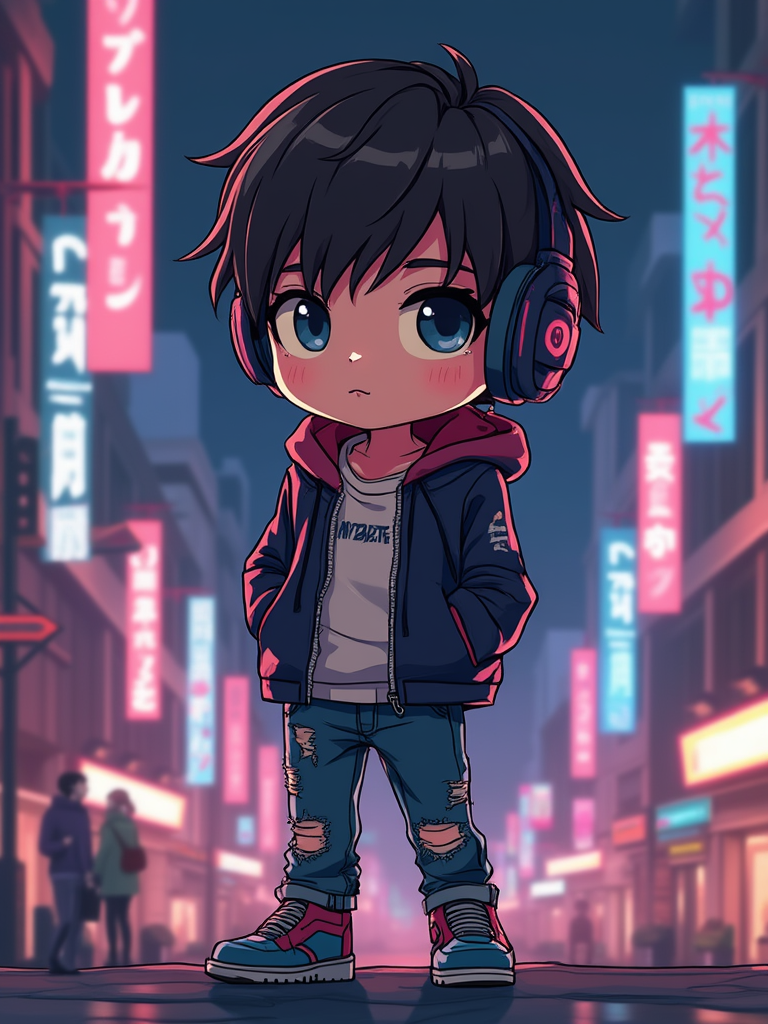 The model as a chibi streetwear character, wearing a trendy jacket, ripped jeans, and headphones. The background is a neon-lit city at night. The style is in cute chibi anime illustration.