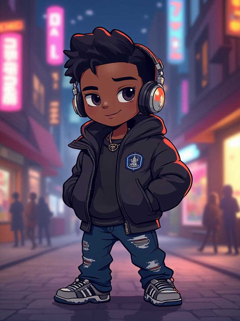 The model as a chibi streetwear character, wearing a trendy jacket, ripped jeans, and headphones. The background is a neon-lit city at night. The style is in cute chibi anime illustration.