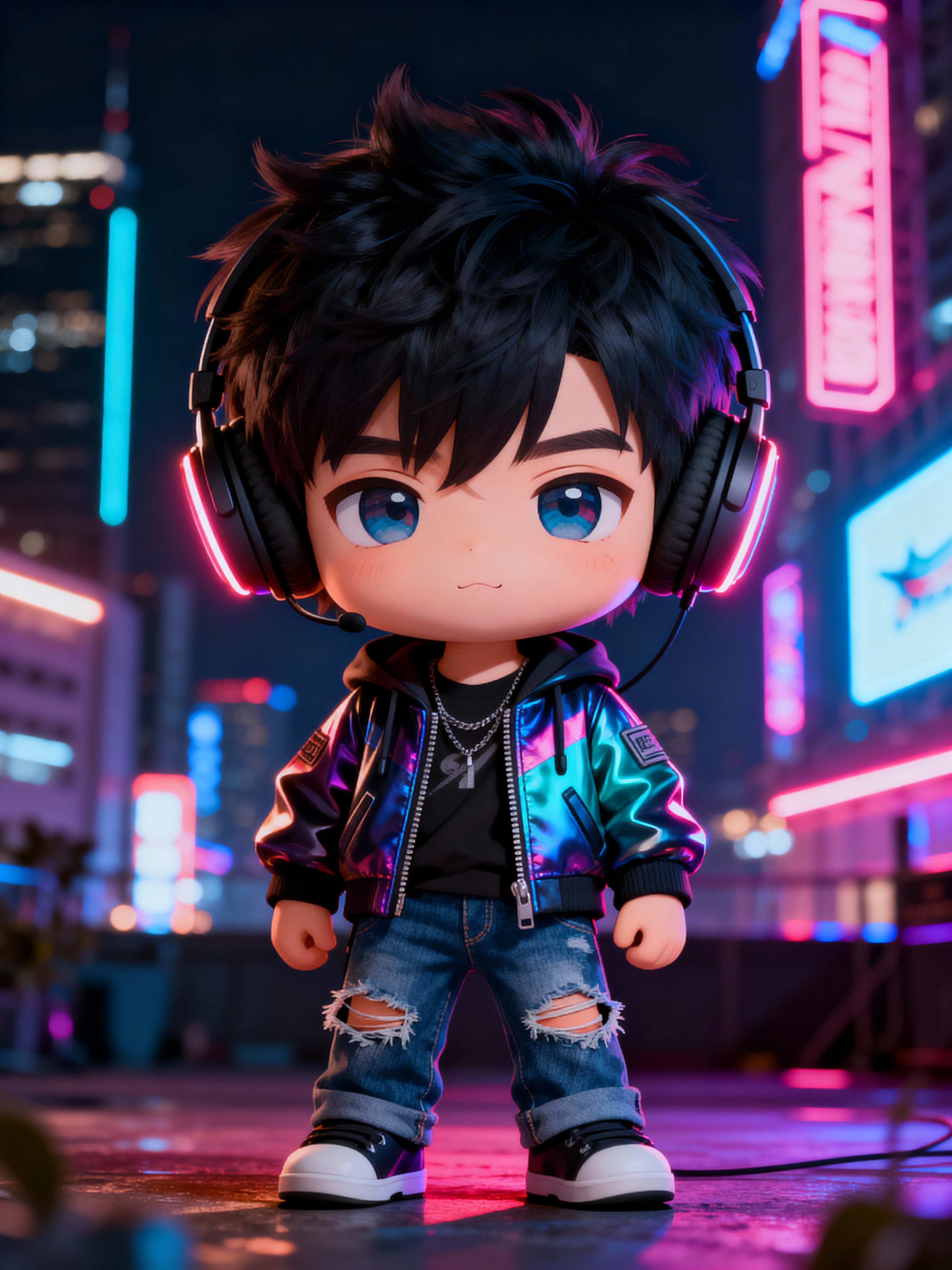 The model as a chibi streetwear character, wearing a trendy jacket, ripped jeans, and headphones. The background is a neon-lit city at night. The style is in cute chibi anime illustration.