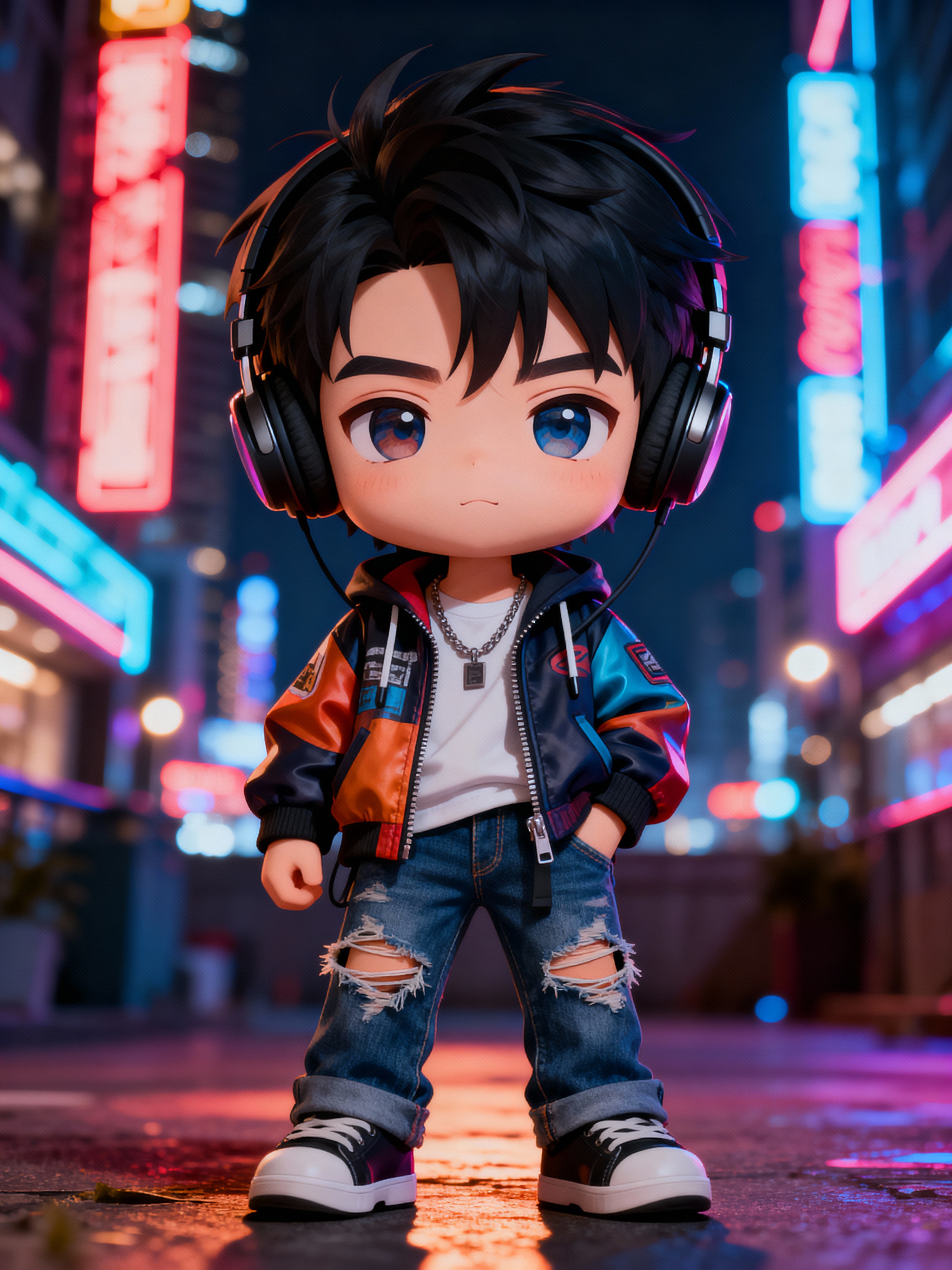 The model as a chibi streetwear character, wearing a trendy jacket, ripped jeans, and headphones. The background is a neon-lit city at night. The style is in cute chibi anime illustration.