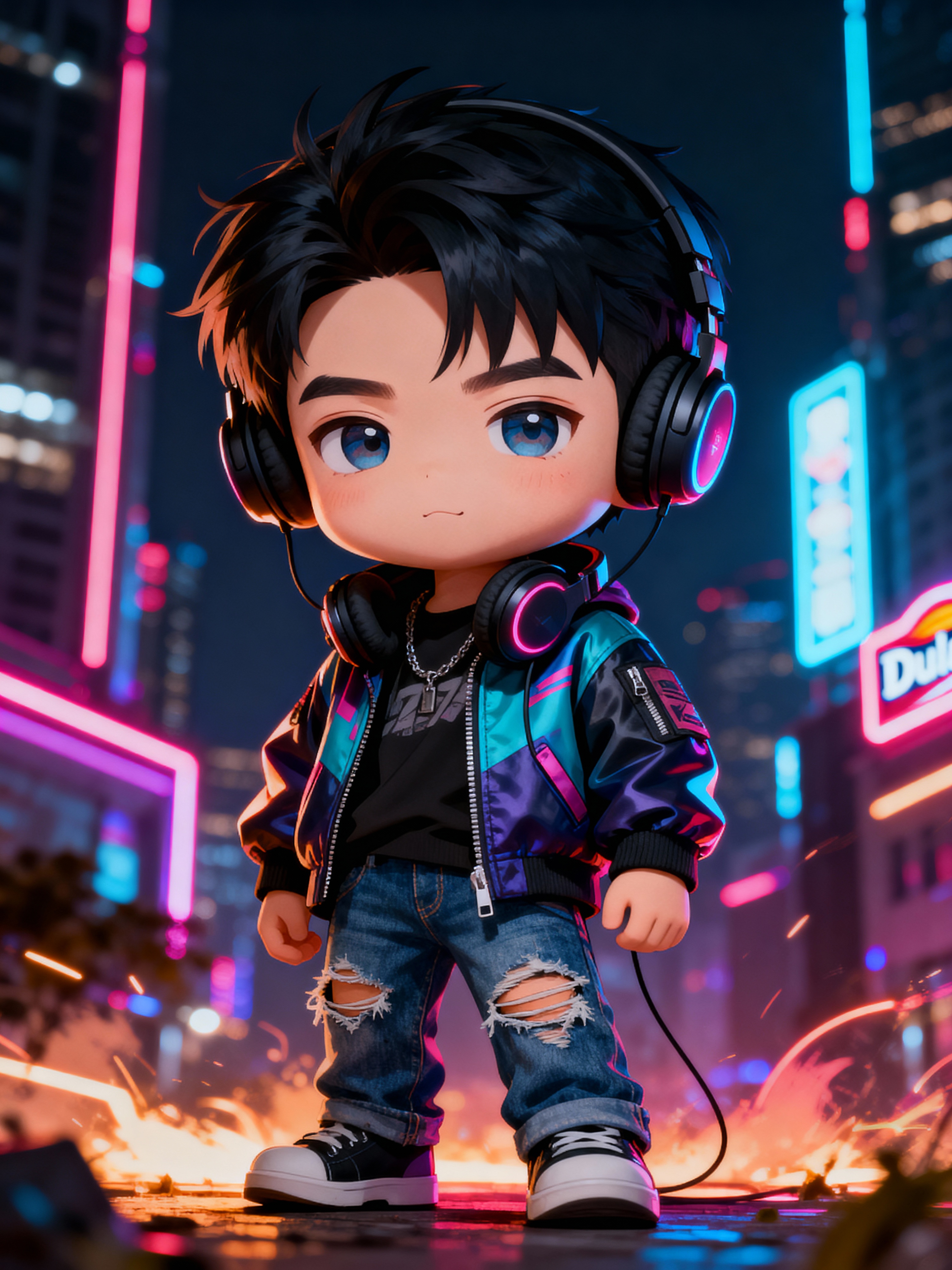 The model as a chibi streetwear character, wearing a trendy jacket, ripped jeans, and headphones. The background is a neon-lit city at night. The style is in cute chibi anime illustration.