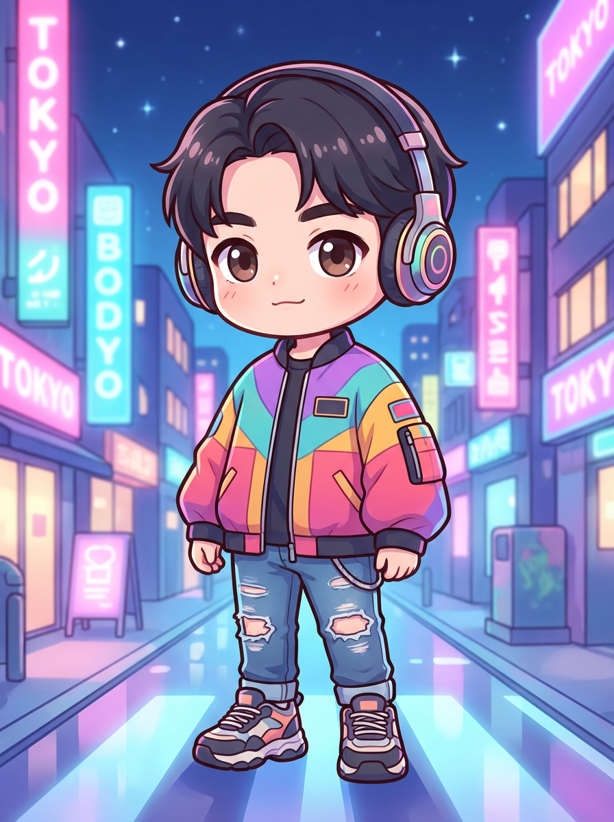 The model as a chibi streetwear character, wearing a trendy jacket, ripped jeans, and headphones. The background is a neon-lit city at night. The style is in cute chibi anime illustration.