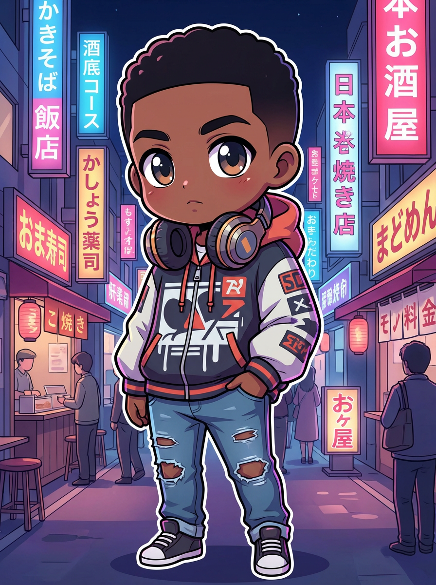 The model as a chibi streetwear character, wearing a trendy jacket, ripped jeans, and headphones. The background is a neon-lit city at night. The style is in cute chibi anime illustration.