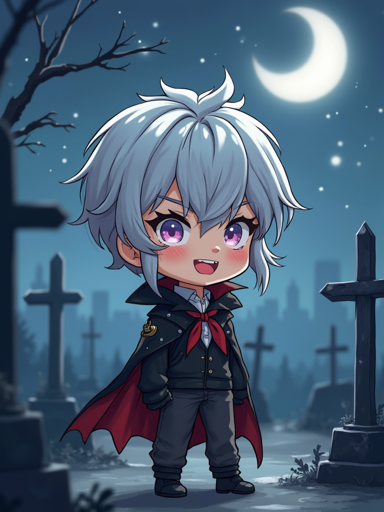 The model as a chibi vampire with tiny fangs and a mischievous smile, wearing a little vampire cloak and silver hair. The setting is a moonlit graveyard. The style is in cute chibi anime illustration.