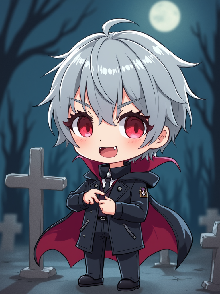 The model as a chibi vampire with tiny fangs and a mischievous smile, wearing a little vampire cloak and silver hair. The setting is a moonlit graveyard. The style is in cute chibi anime illustration.