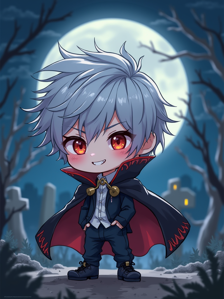 The model as a chibi vampire with tiny fangs and a mischievous smile, wearing a little vampire cloak and silver hair. The setting is a moonlit graveyard. The style is in cute chibi anime illustration.