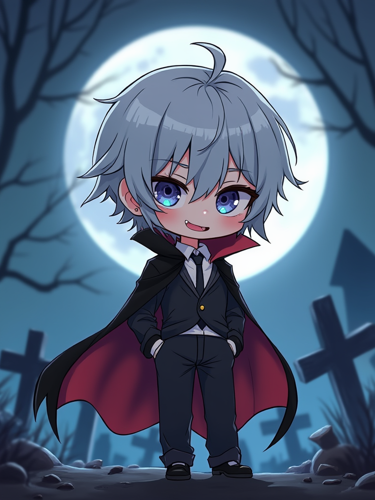 The model as a chibi vampire with tiny fangs and a mischievous smile, wearing a little vampire cloak and silver hair. The setting is a moonlit graveyard. The style is in cute chibi anime illustration.