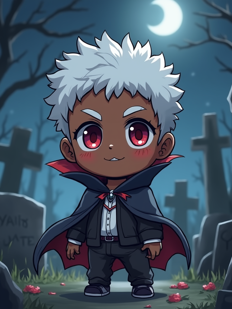 The model as a chibi vampire with tiny fangs and a mischievous smile, wearing a little vampire cloak and silver hair. The setting is a moonlit graveyard. The style is in cute chibi anime illustration.