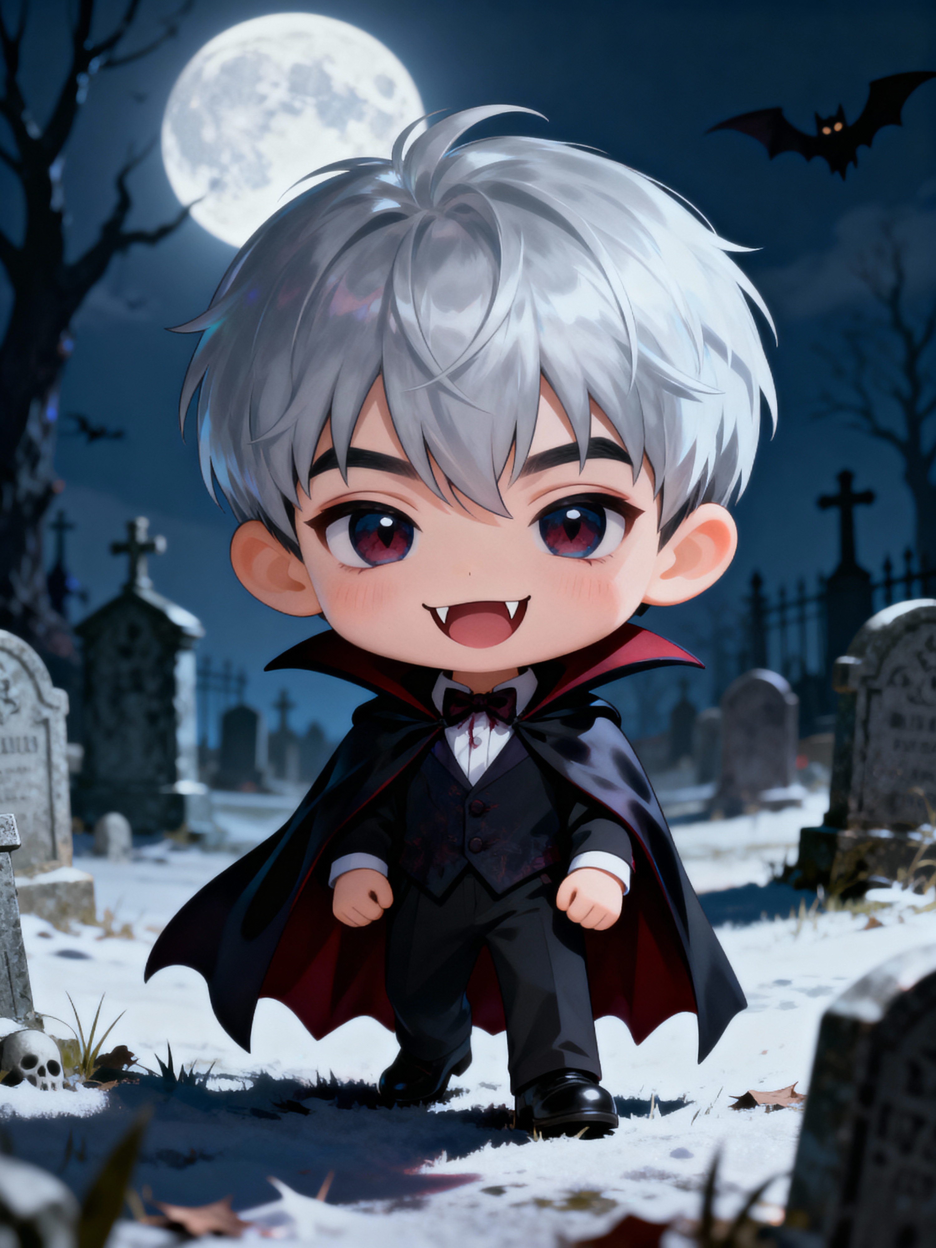 The model as a chibi vampire with tiny fangs and a mischievous smile, wearing a little vampire cloak and silver hair. The setting is a moonlit graveyard. The style is in cute chibi anime illustration.
