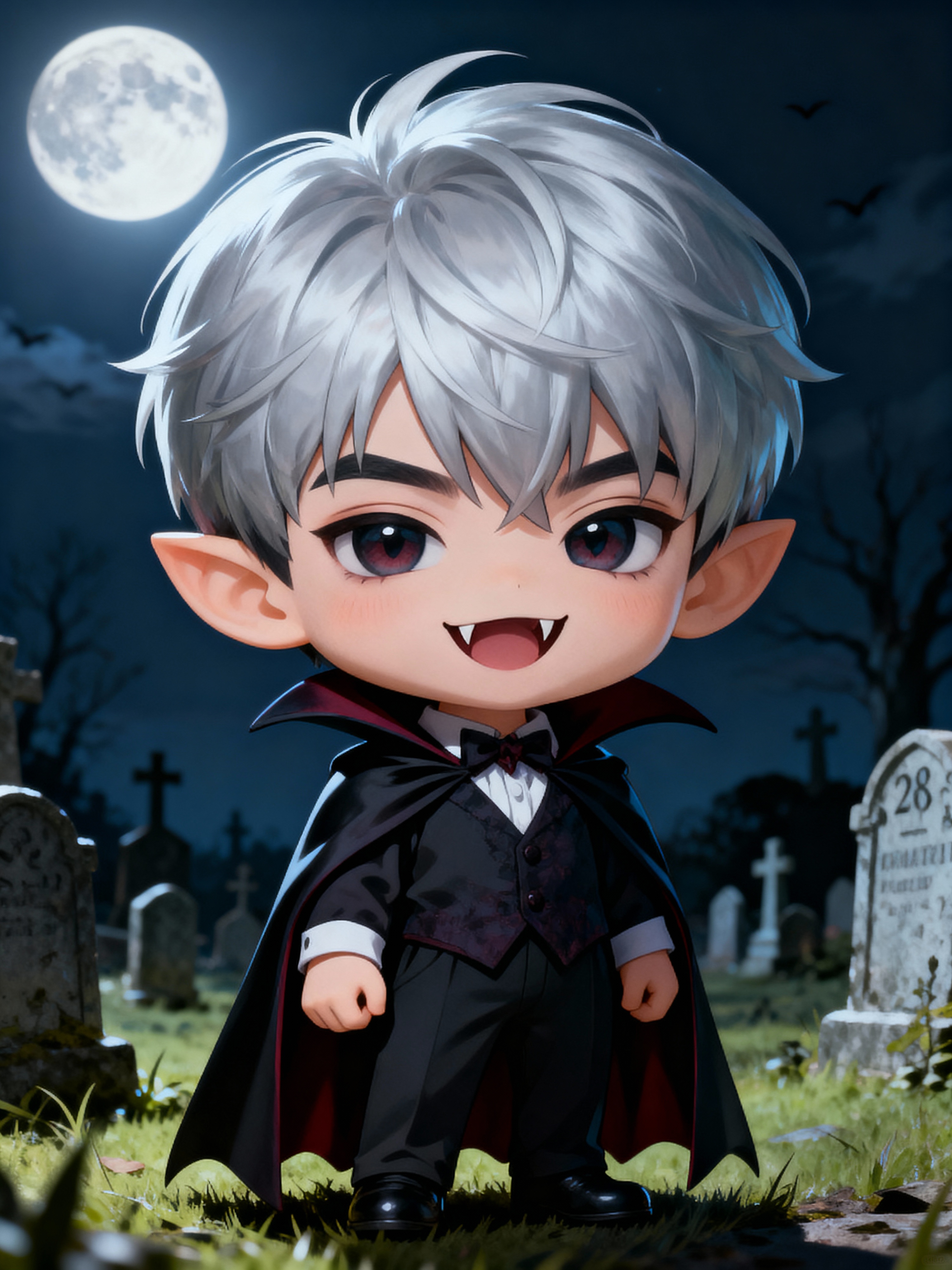 The model as a chibi vampire with tiny fangs and a mischievous smile, wearing a little vampire cloak and silver hair. The setting is a moonlit graveyard. The style is in cute chibi anime illustration.