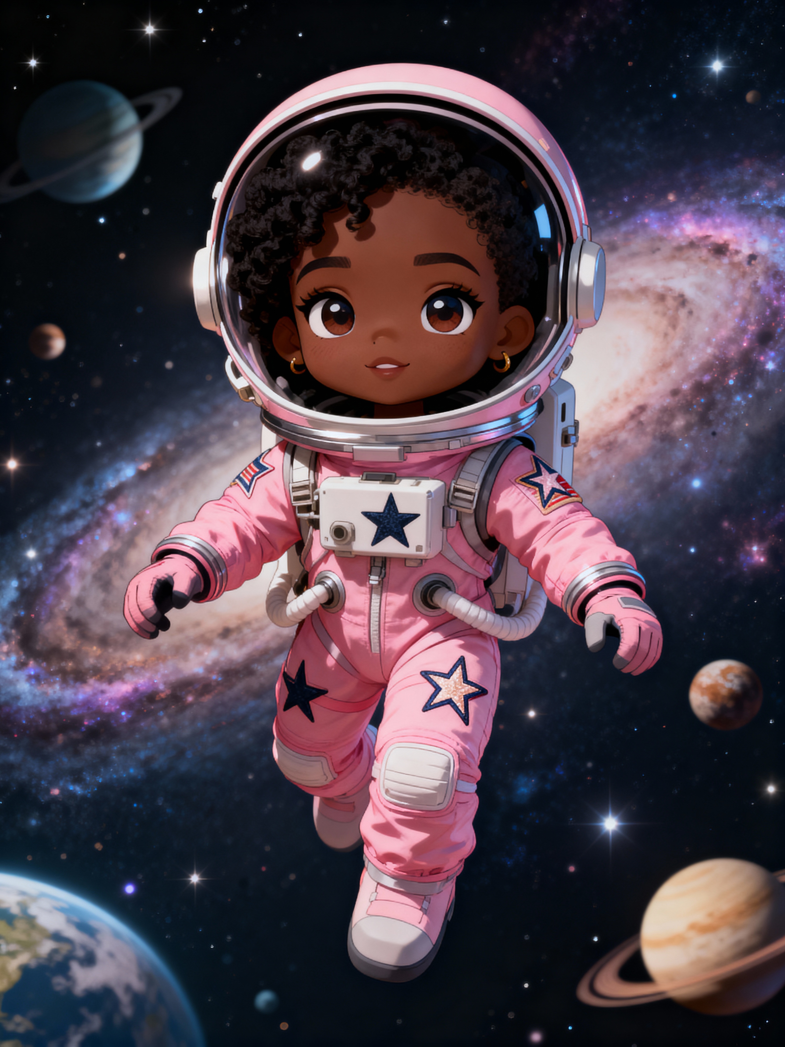 The model as a chibi astronaut floating in space, wearing a pink space suit with star patches . The background is a galaxy with planets and stars. The style is in cute chibi anime illustration.