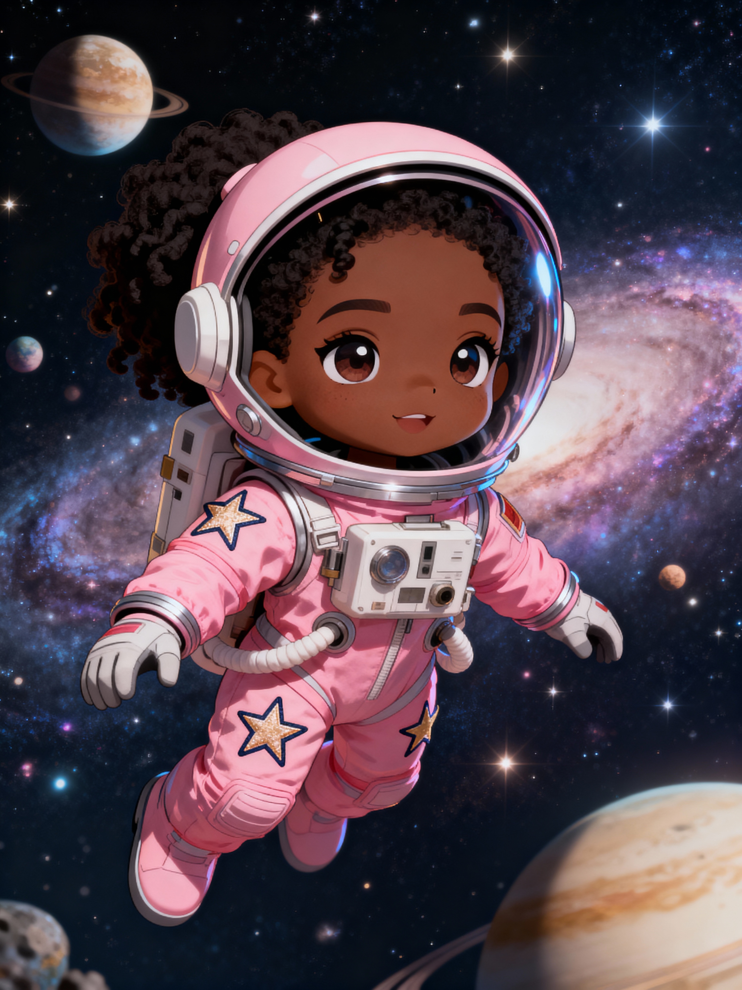 The model as a chibi astronaut floating in space, wearing a pink space suit with star patches . The background is a galaxy with planets and stars. The style is in cute chibi anime illustration.