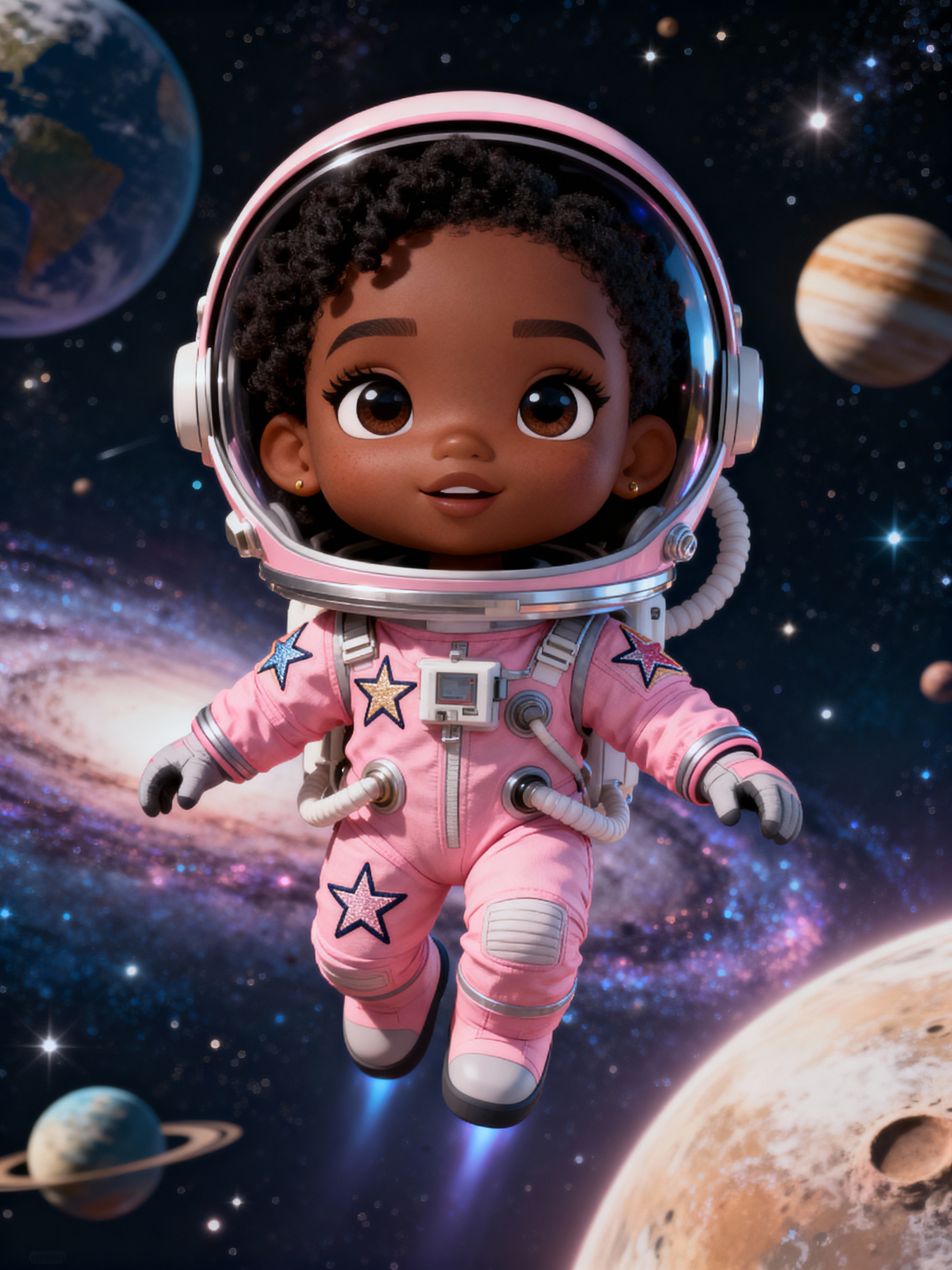 The model as a chibi astronaut floating in space, wearing a pink space suit with star patches . The background is a galaxy with planets and stars. The style is in cute chibi anime illustration.
