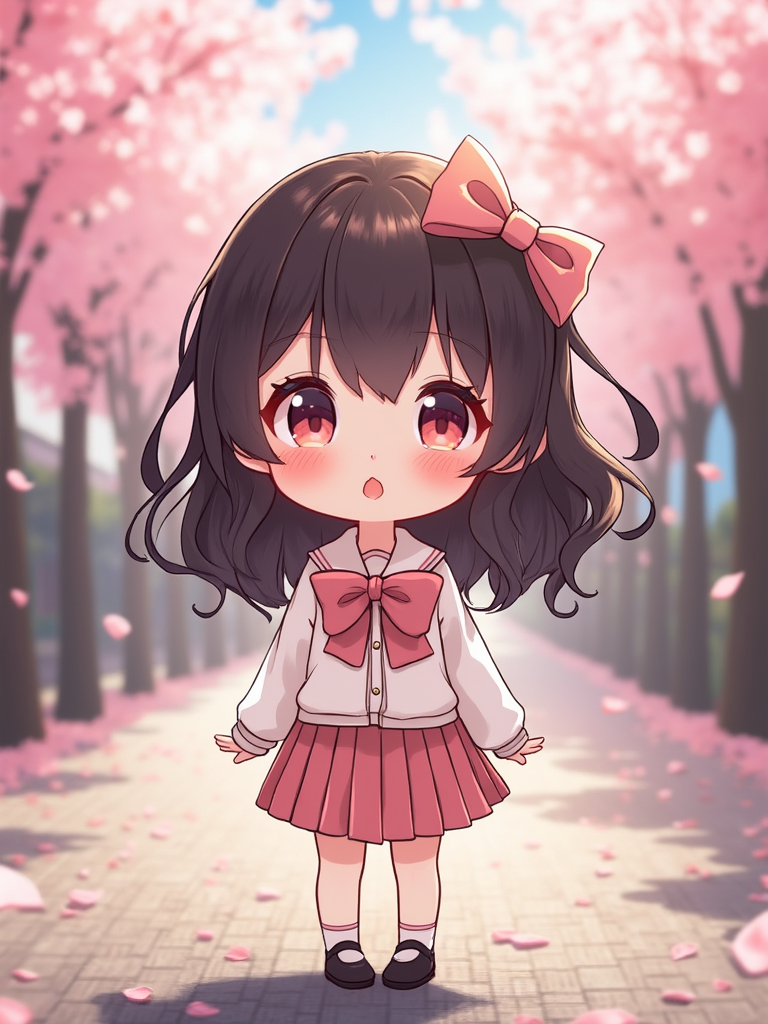 The model as a chibi character standing on a peaceful Japanese street during cherry blossom season, wearing a pastel school uniform with a big bow and wavy hair . The background is filled with pink petals and soft sunlight. Highly detailed chibi-style rendering with vibrant colors and a magical atmosphere.
