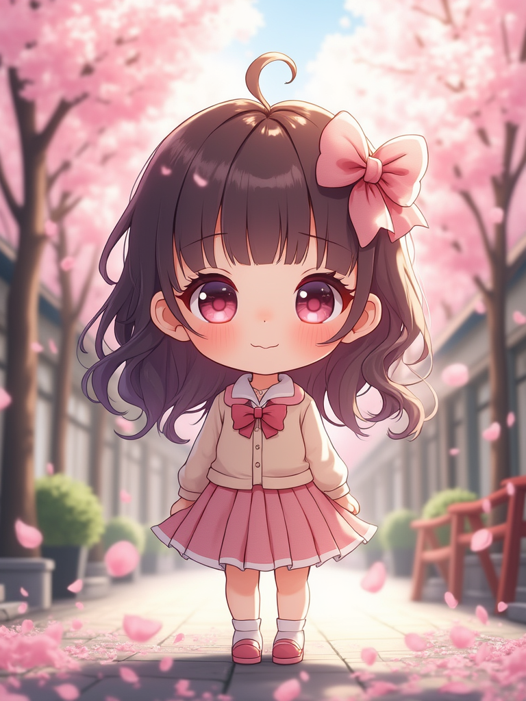 The model as a chibi character standing on a peaceful Japanese street during cherry blossom season, wearing a pastel school uniform with a big bow and wavy hair . The background is filled with pink petals and soft sunlight. Highly detailed chibi-style rendering with vibrant colors and a magical atmosphere.