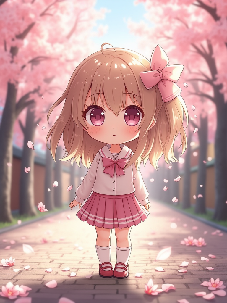 The model as a chibi character standing on a peaceful Japanese street during cherry blossom season, wearing a pastel school uniform with a big bow and wavy hair . The background is filled with pink petals and soft sunlight. Highly detailed chibi-style rendering with vibrant colors and a magical atmosphere.