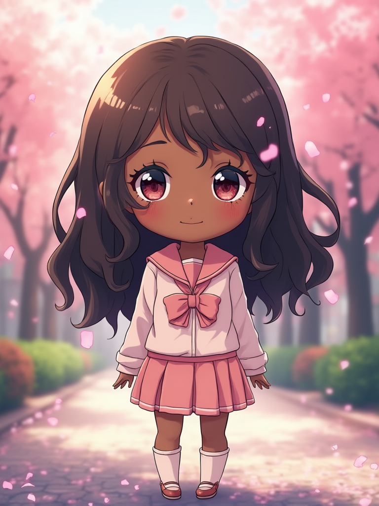 The model as a chibi character standing on a peaceful Japanese street during cherry blossom season, wearing a pastel school uniform with a big bow and wavy hair . The background is filled with pink petals and soft sunlight. Highly detailed chibi-style rendering with vibrant colors and a magical atmosphere.