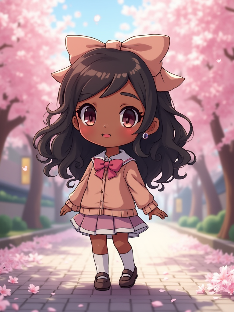 The model as a chibi character standing on a peaceful Japanese street during cherry blossom season, wearing a pastel school uniform with a big bow and wavy hair . The background is filled with pink petals and soft sunlight. Highly detailed chibi-style rendering with vibrant colors and a magical atmosphere.