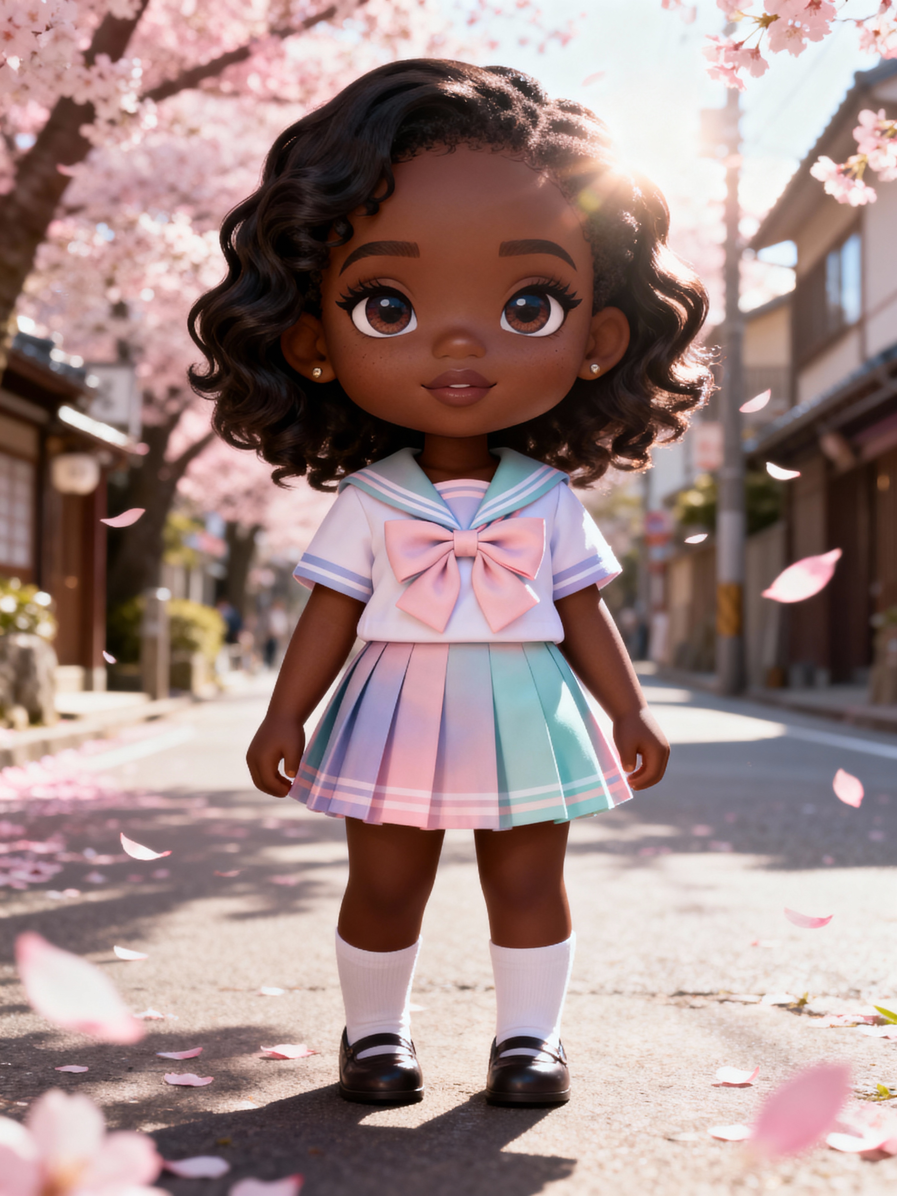 The model as a chibi character standing on a peaceful Japanese street during cherry blossom season, wearing a pastel school uniform with a big bow and wavy hair . The background is filled with pink petals and soft sunlight. Highly detailed chibi-style rendering with vibrant colors and a magical atmosphere.