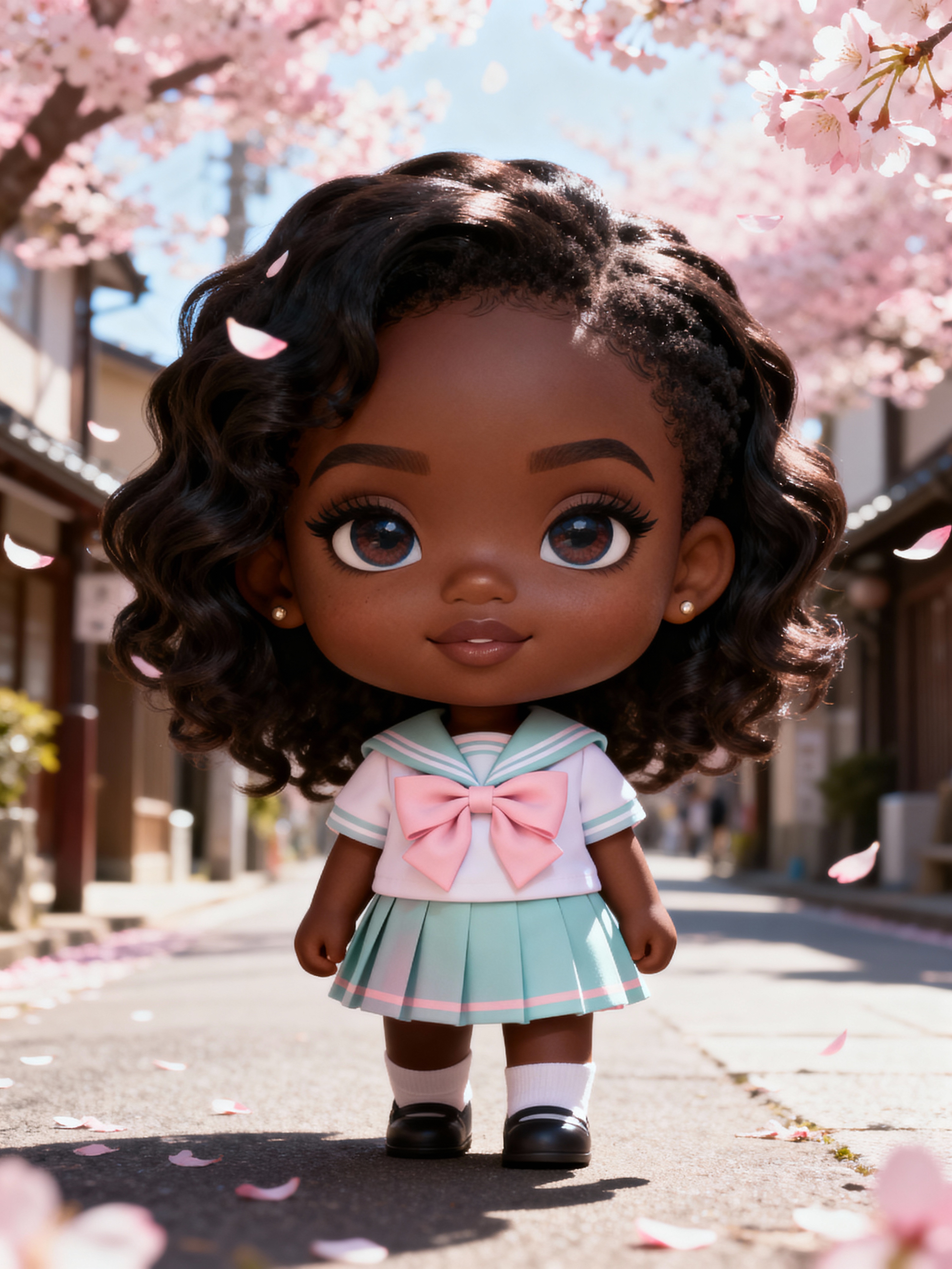 The model as a chibi character standing on a peaceful Japanese street during cherry blossom season, wearing a pastel school uniform with a big bow and wavy hair . The background is filled with pink petals and soft sunlight. Highly detailed chibi-style rendering with vibrant colors and a magical atmosphere.