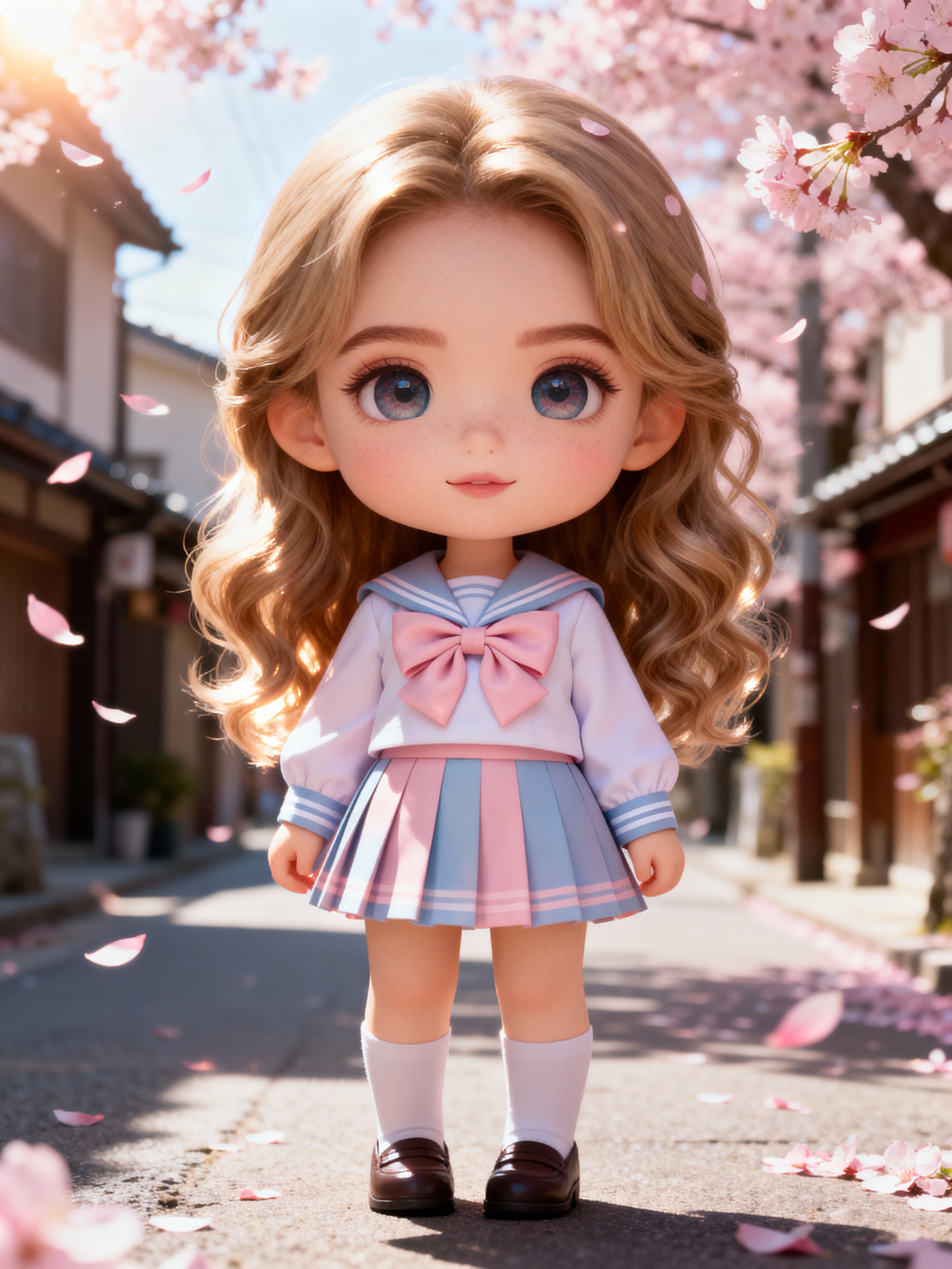 The model as a chibi character standing on a peaceful Japanese street during cherry blossom season, wearing a pastel school uniform with a big bow and wavy hair . The background is filled with pink petals and soft sunlight. Highly detailed chibi-style rendering with vibrant colors and a magical atmosphere.