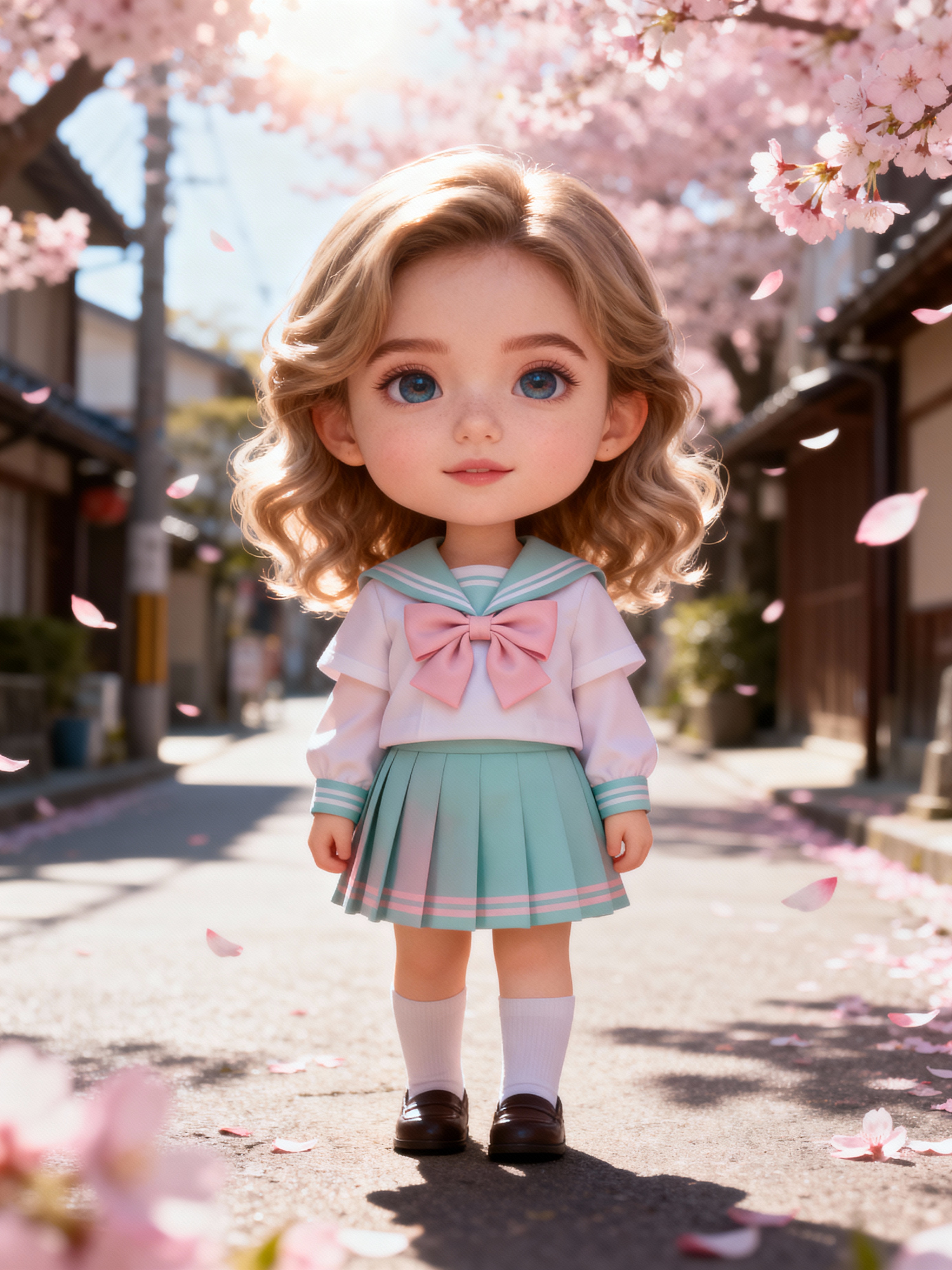 The model as a chibi character standing on a peaceful Japanese street during cherry blossom season, wearing a pastel school uniform with a big bow and wavy hair . The background is filled with pink petals and soft sunlight. Highly detailed chibi-style rendering with vibrant colors and a magical atmosphere.