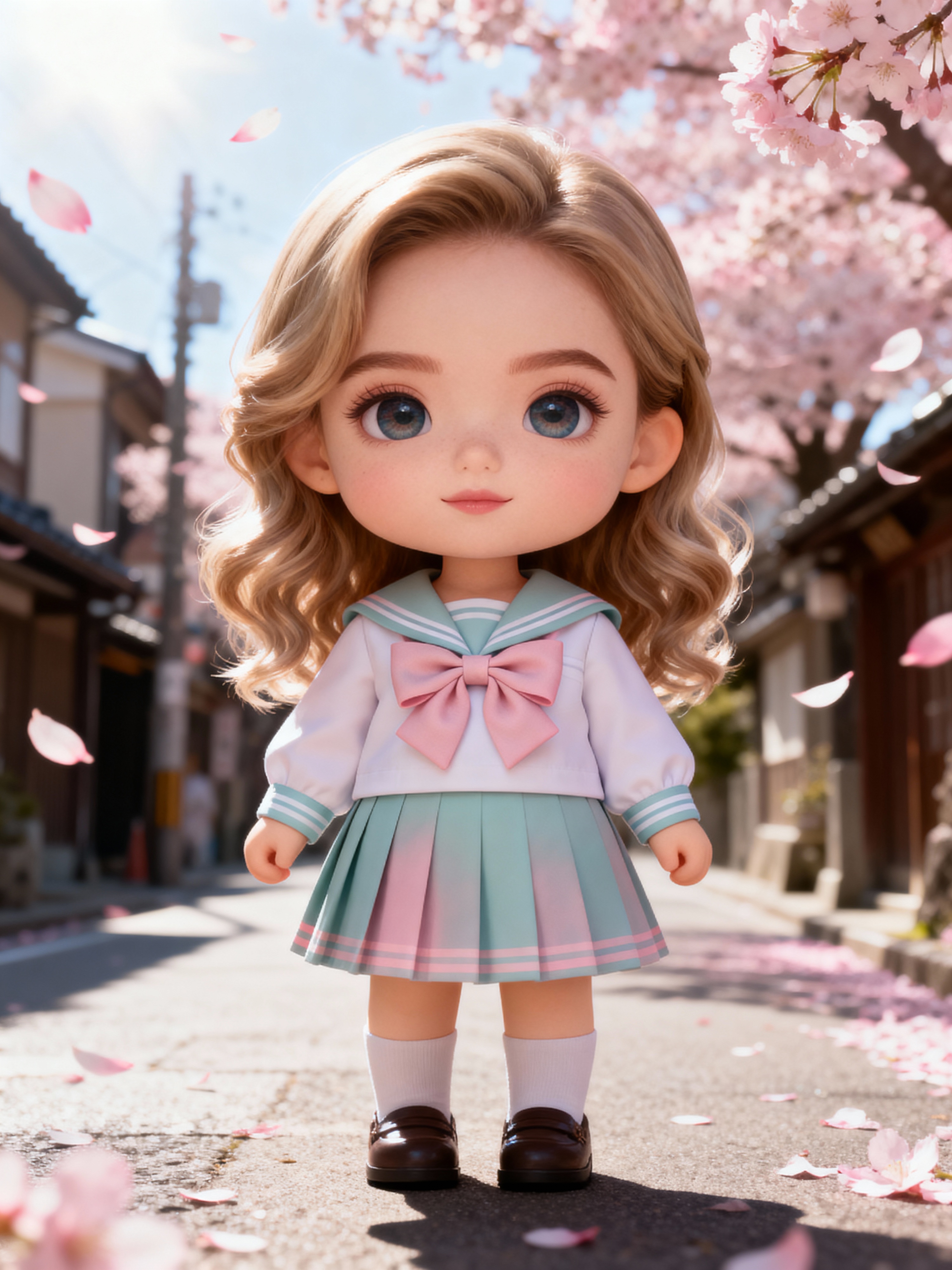 The model as a chibi character standing on a peaceful Japanese street during cherry blossom season, wearing a pastel school uniform with a big bow and wavy hair . The background is filled with pink petals and soft sunlight. Highly detailed chibi-style rendering with vibrant colors and a magical atmosphere.