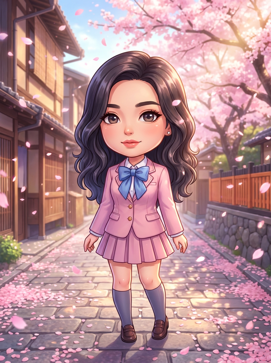 The model as a chibi character standing on a peaceful Japanese street during cherry blossom season, wearing a pastel school uniform with a big bow and wavy hair . The background is filled with pink petals and soft sunlight. Highly detailed chibi-style rendering with vibrant colors and a magical atmosphere.